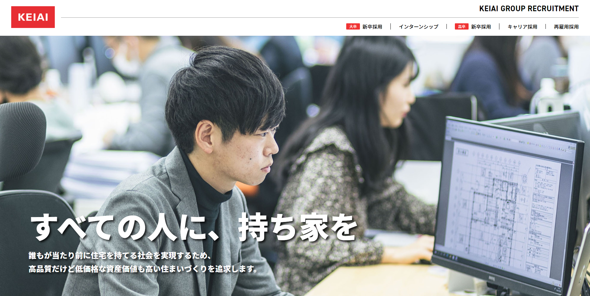 「豊かで楽しく快適なくらしの創造」を経営理念に、「すべての人に持ち家を」をビジョンに掲げ、『高品質だけど低価格なデザイン住宅』を提供しています。仕入れから販売までを一気通貫で行うリアル×テクノロジーの基盤である「KEIAIプラットフォーム」を構築。テクノロジーの積極的な導入とコンパクト戸建住宅による独自のビジネスモデルによって、国内分譲住宅市場シェアの拡大を図ります。今後も不動産業界のDXを牽引するリーディングカンパニーとして、価値ある分譲住宅を提供していきます。