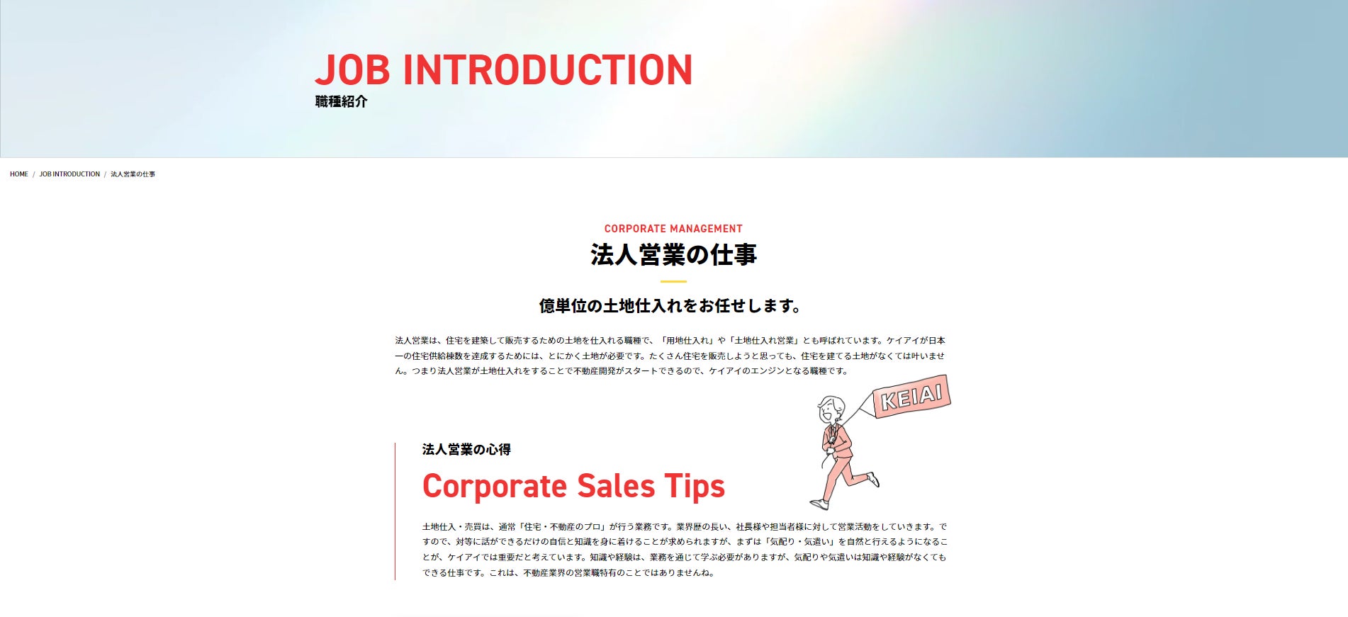 リニューアルサイトでは、法人営業・施工管理・自社販売営業など、当社での仕事内容や魅力について分かりやすく解説し、専門性の高い業務を想起しやすい内容へ刷新しています。