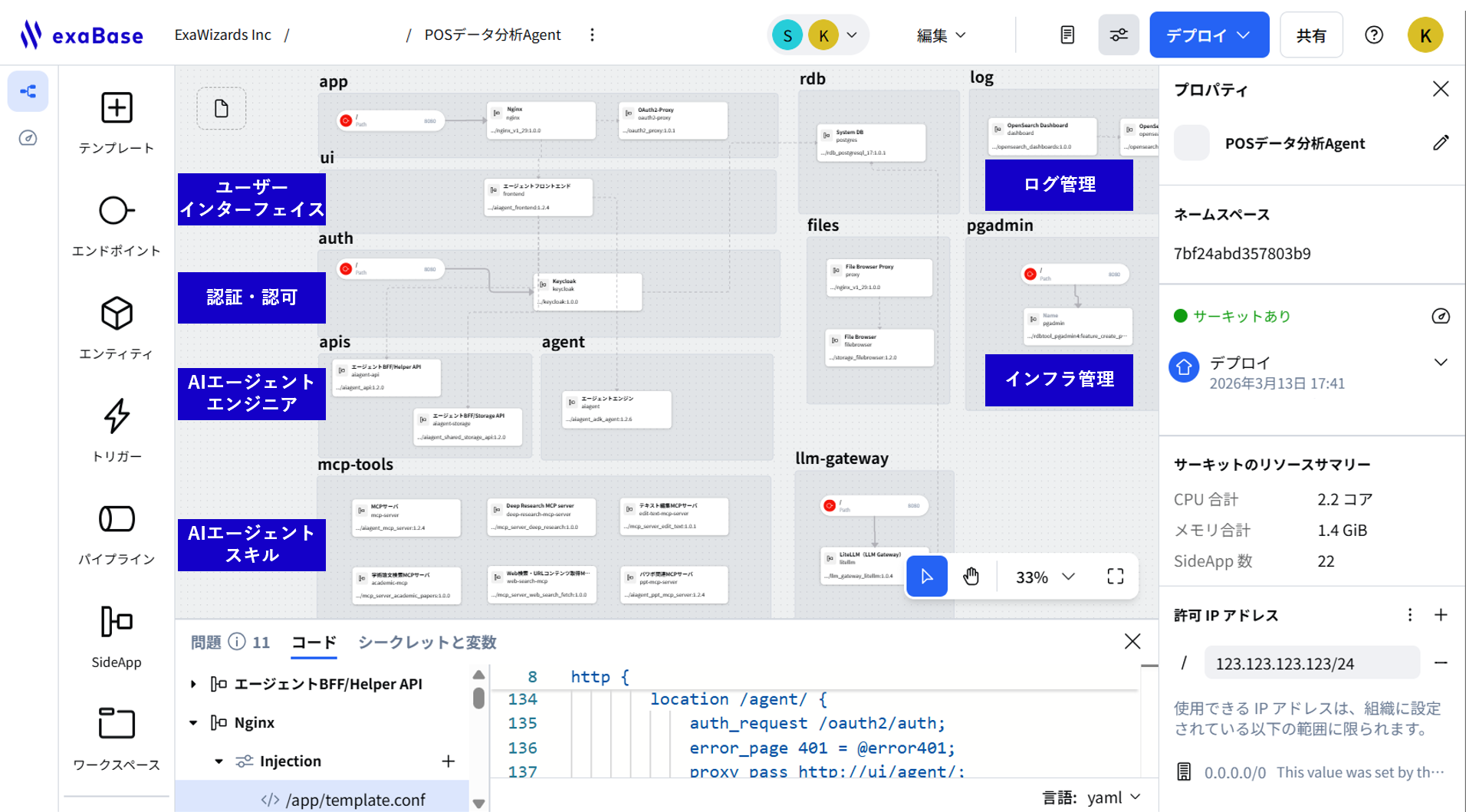 exaBase Studioは、様々なファイルやデータなどを集約し、ユーザーは容易にAIエージェントやAIアプリケーションの制作が可能なAIエージェント開発・運用プラットフォームです。業務ですぐに使い始めることができるアプリケーションのテンプレートを提供しており、社内データと接続し、ユーザーと対話しながら自動化したい業務をAIエージェントのタスクに落とし込んでいくことができます。
