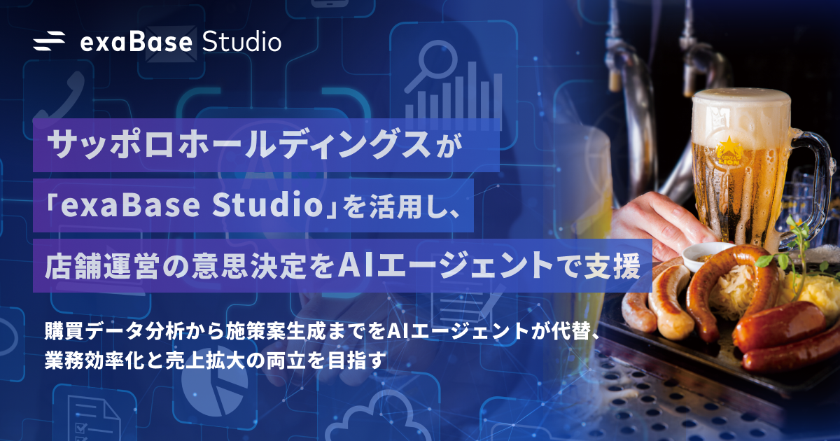 株式会社エクサウィザーズ(本社:東京都港区、代表取締役社長CEO:春田 真、以下エクサウィザーズ)は、サッポロホールディングス株式会社(以下サッポロホールディングス)が実施する、AIエージェント開発・運用プラットフォーム「exaBase Studio」を活用した購買データ分析を支援してきました。その結果として、AIエージェントが生成した施策のテスト展開が開始されることをお知らせします。サッポロホールディングスは、店舗運営における購買データ分析から施策案生成までをAIエージェントが代替することで、業務効率化と売上拡大の両立を目指し、エクサウィザーズはそれを支援します。本施策はグループ企業である(株)サッポロライオンの銀座ライオン渋谷マークシティ店において3月16日より実施されます。