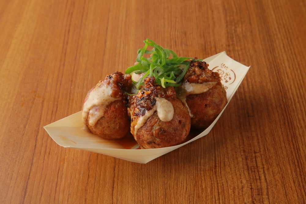 白ごまだれを使用し、ひき肉を四川風・麻婆テイストでシビ辛に仕上げました。四川麻婆がたこ焼と絡み、アルコールとの相性も抜群!