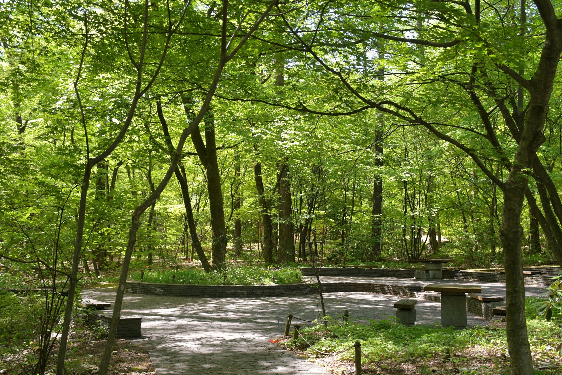 会場は、休憩レストランの前、「入口広場」の円型スペース。ロケーションが良く、備え付けのテーブルやイスのある人気の休憩スポットです。新緑の木々に囲まれ、木漏れ日の中、風がそよぐ葉の音を聞きながらのクラフト体験は当公園ならではです。