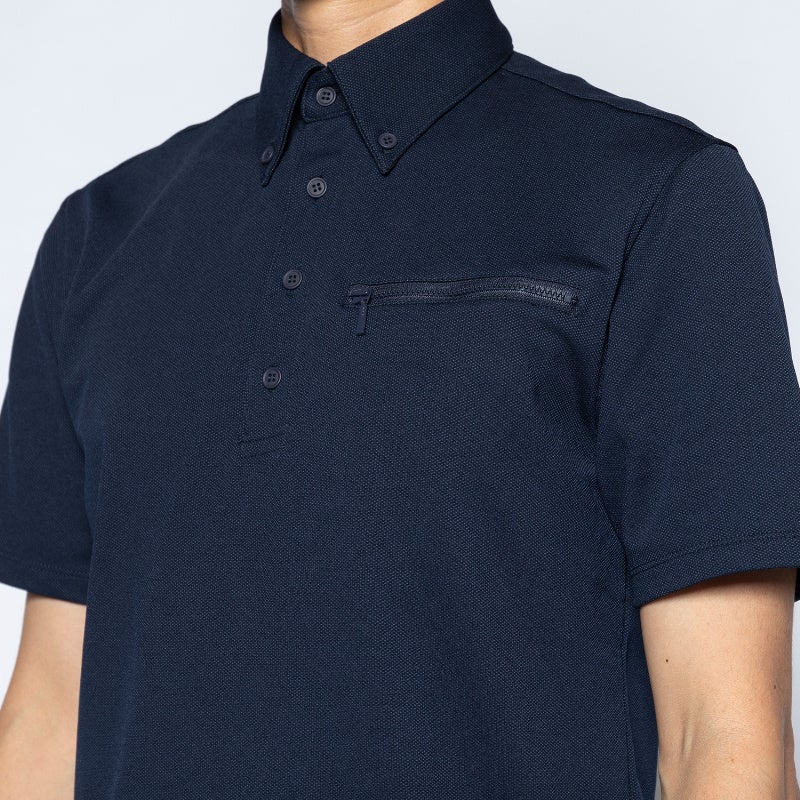 特徴:左胸には、スマホや小物を収納できるジップ付き胸ポケットを搭載。胸ポケット内側にはペン刺しも搭載しております。しゃがんでも背中が見えないように後ろの丈が少し長めになっています。シワになりにくくアイロンが不要。部屋干しでもすぐ乾く速乾性があります。