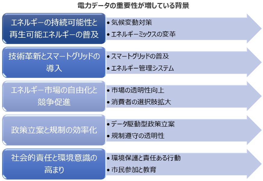 これらの背景により、電力分野におけるオープンデータは、技術革新や政策立案の推進、市場の透明性向上、社会的責任の遂行において、ますます重要な役割を果たしています。