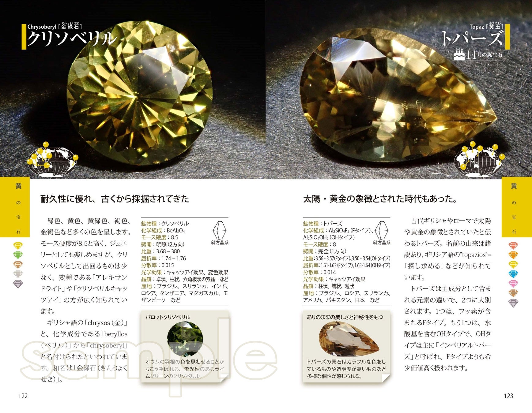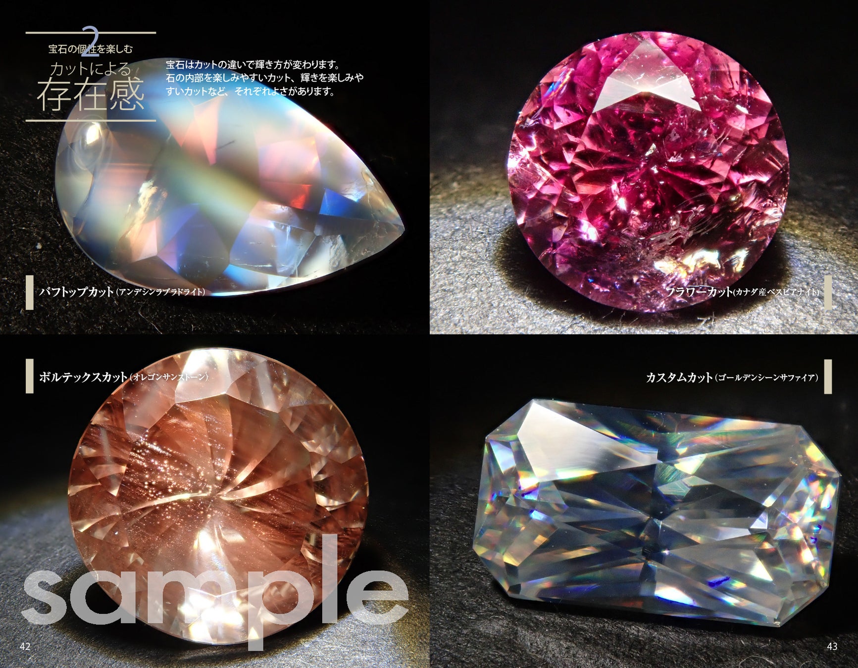 各宝石の基本データはもちろん、産地別による色の違いと等級、地質学的見地など、細かくスペック表示し、より深い宝石のテキストとして長く使用できるよう工夫しています。新基準の誕生石や、これまで見たこともない希少石まで300種超の宝石を掲載。目新しい要素がふんだんに盛り込まれています。