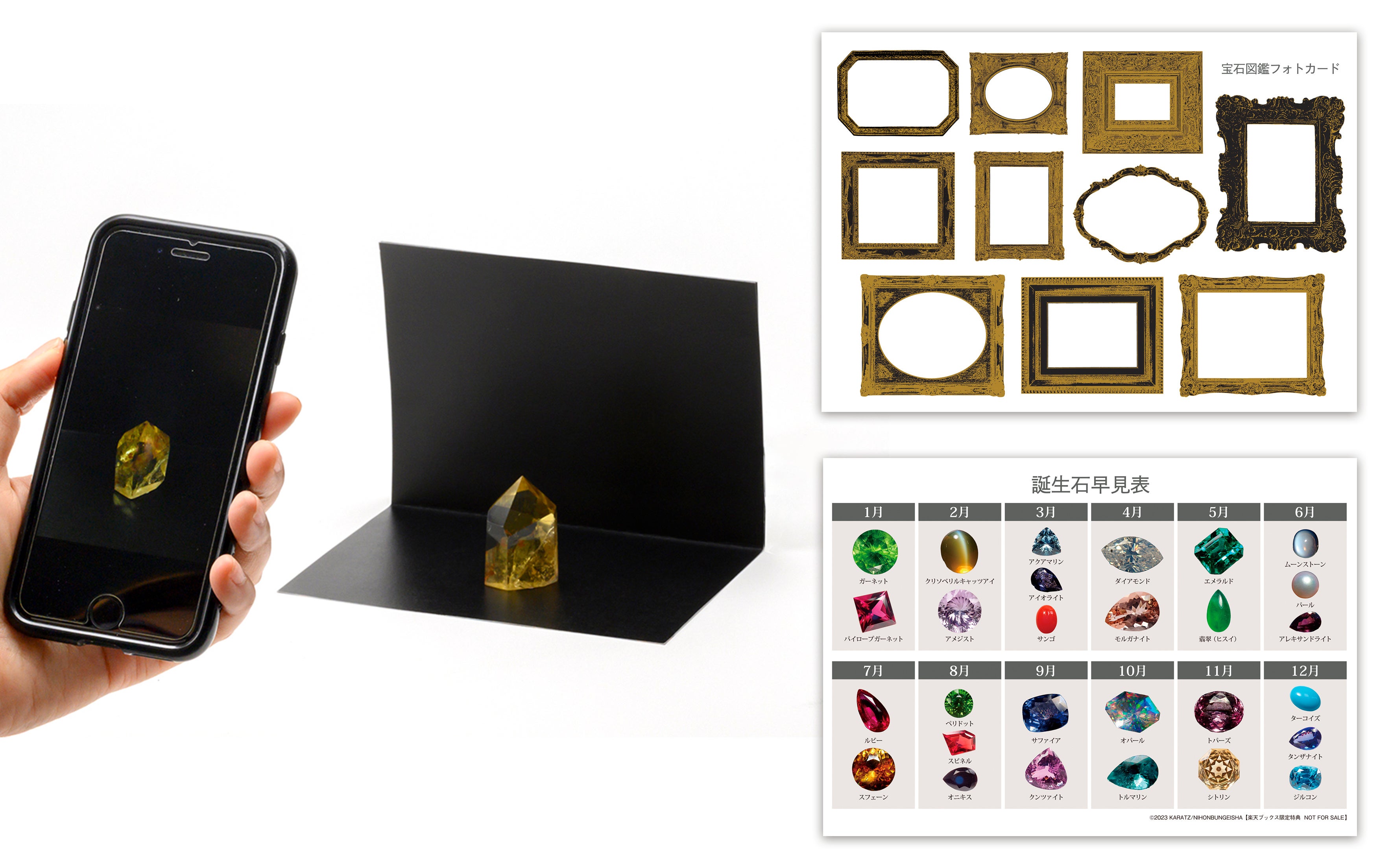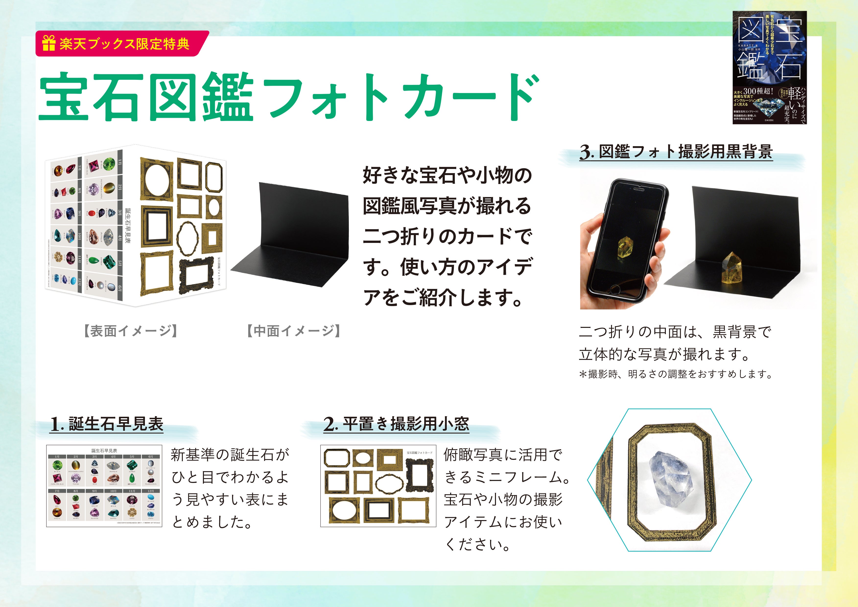 楽天ブックスでは数量限定の特典「宝石図鑑フォトカード」をご用意しました。好きな宝石や小物の図鑑風写真が撮れる二つ折りカードです。中面は黒背景で立体的な写真が撮れるブラックパターン。表面には、俯瞰写真に活用できるミニフレームと誕生石早見表を配しました。(二つ折り時のサイズ 105mm×148mm)