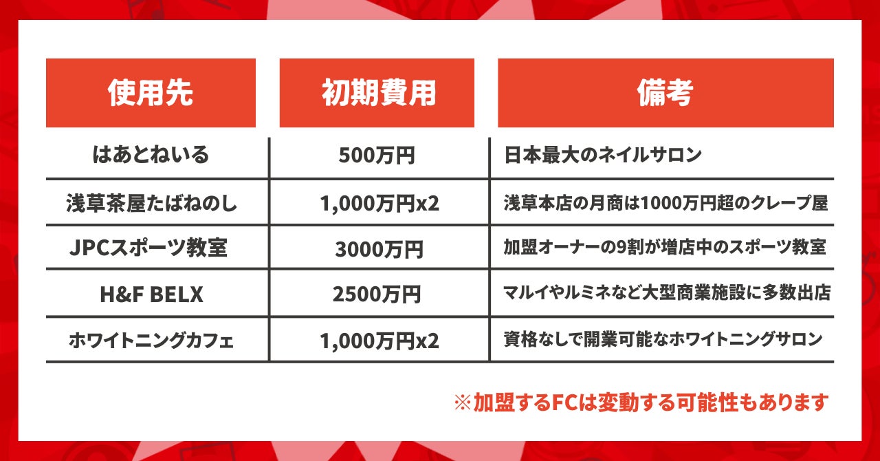 集めた軍資金を基に、主に以下のフランチャイズに加盟する予定です。