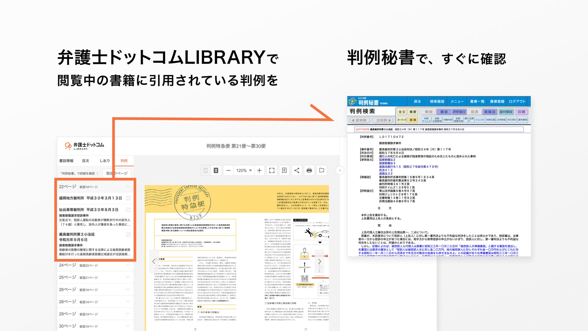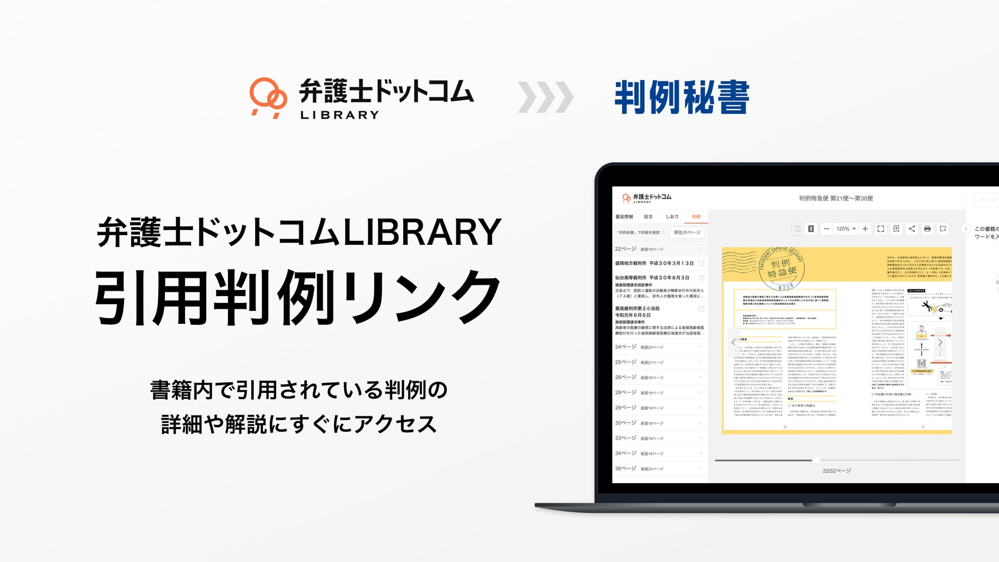 弁護士ドットコム株式会社(東京都港区、代表取締役社長 兼 CEO:元榮 太一郎、以下当社)が提供している弁護士向け法律書籍・雑誌の閲覧が可能なリーガルリサーチサービス「弁護士ドットコムLIBRARY®︎」は、LIC社の判例秘書との連携により、法律書籍の中に引用されている約20万件の判例にすぐにアクセスできる「引用判例リンク」機能の提供を開始したことをお知らせします。また、この連携機能を皮切りに、グループシナジーを高めてまいります。