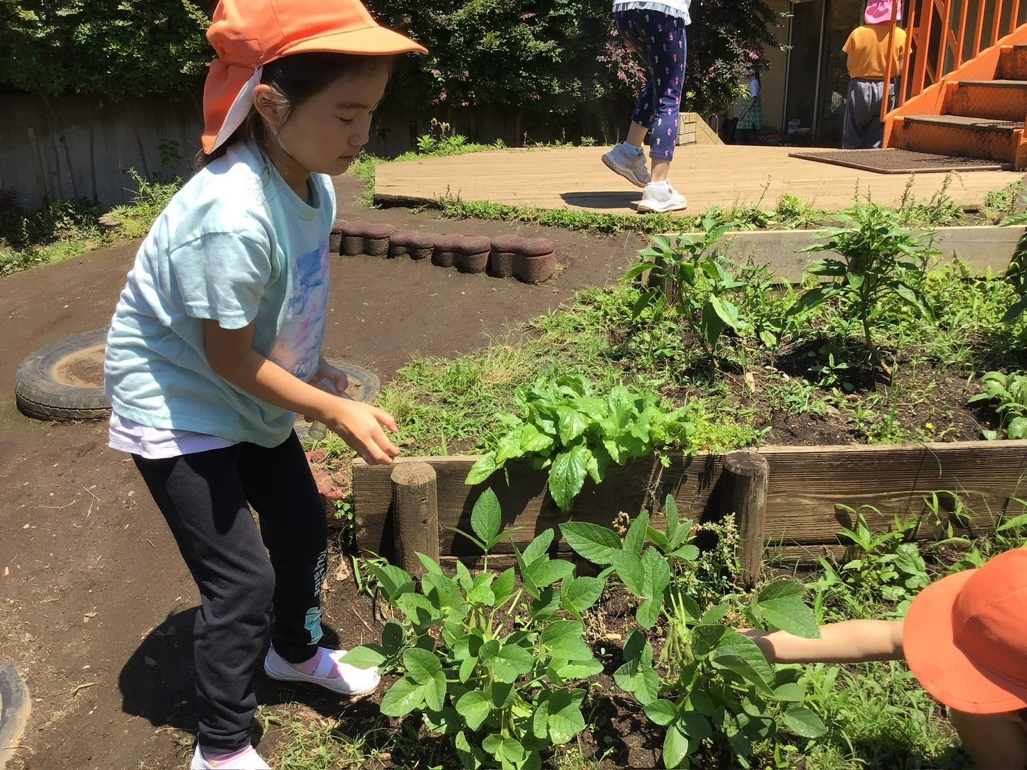 長津田園では、野菜端材をコンポストに入れて堆肥を作り、園庭での野菜栽培に活用しています。また、ポップコーンやかぼちゃの種を土に植える「リボベジ」にも挑戦。園児たちは植物の成長を観察し、種から食べ物ができる仕組みを学びました。