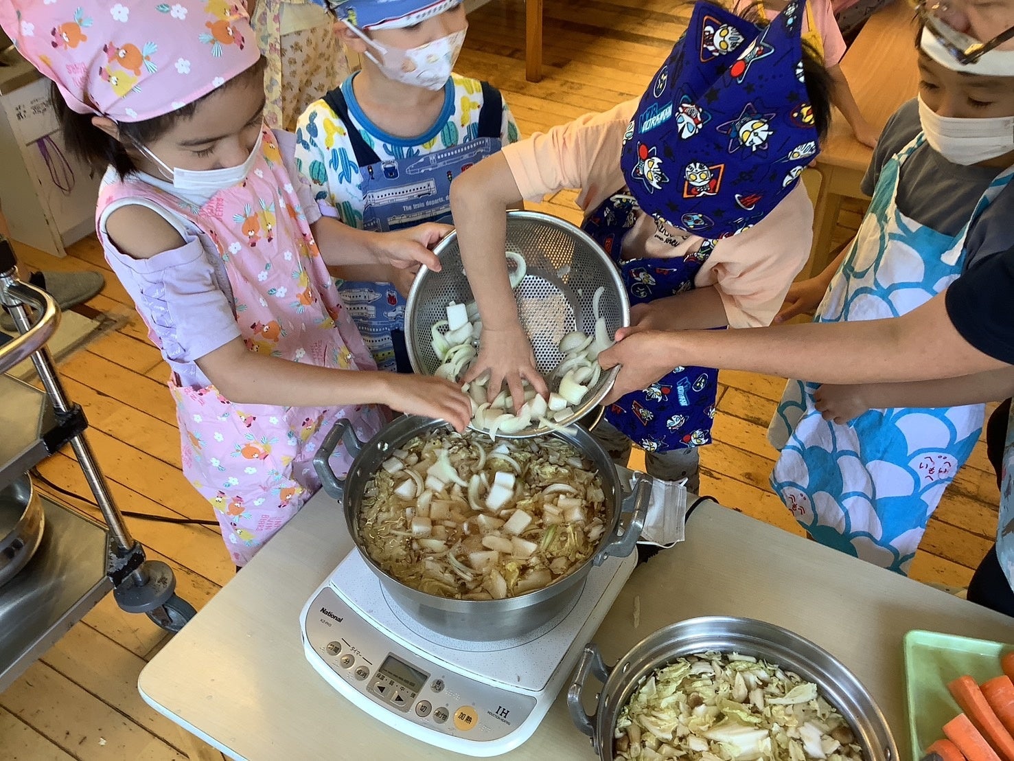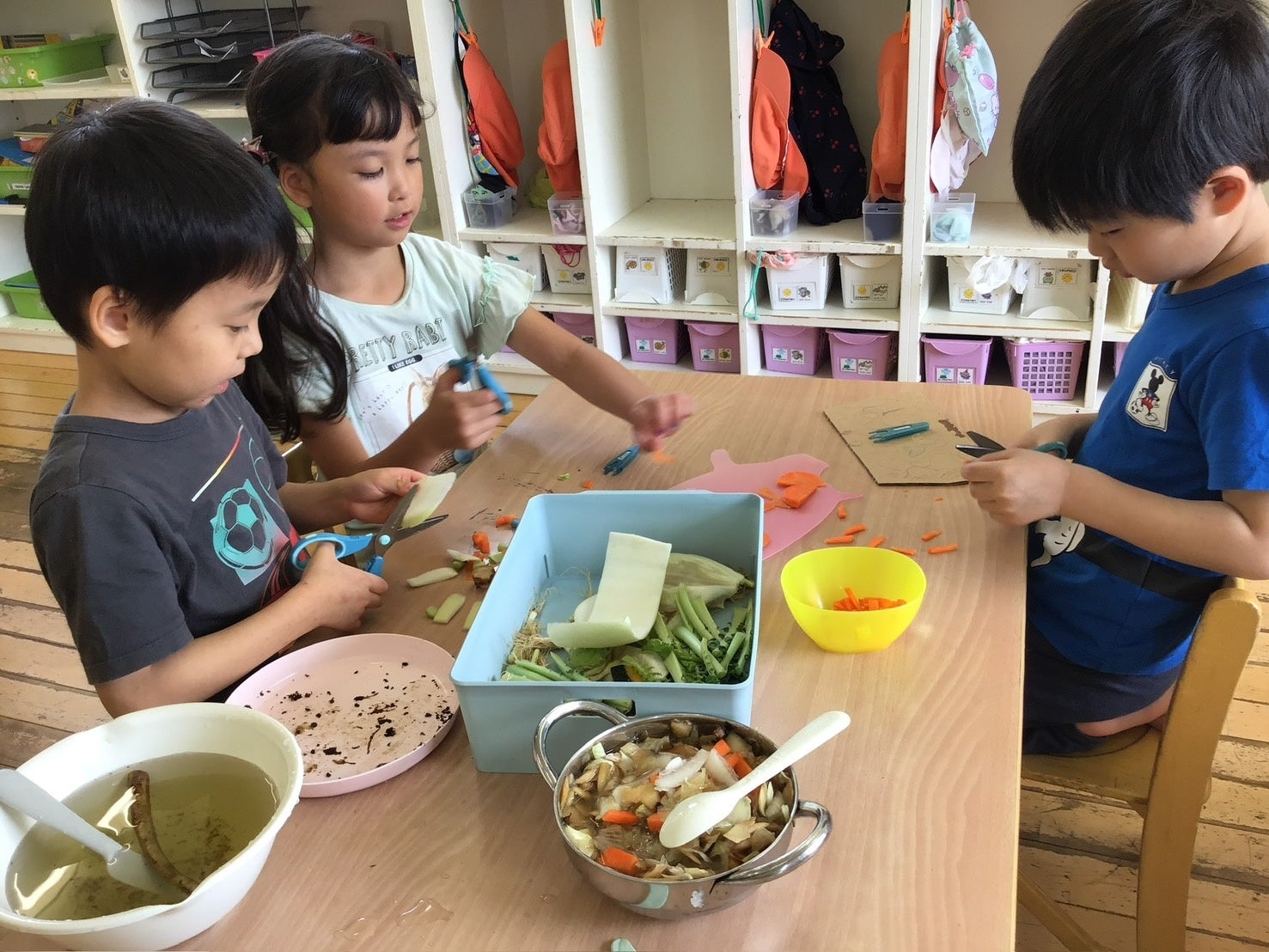 野菜端材を煮出して作るだし「ベジブロス」を使い、みそ汁作りを行いました。自分たちで切った野菜を使ったみそ汁は、普段具材が苦手な園児たちにも好評でした。