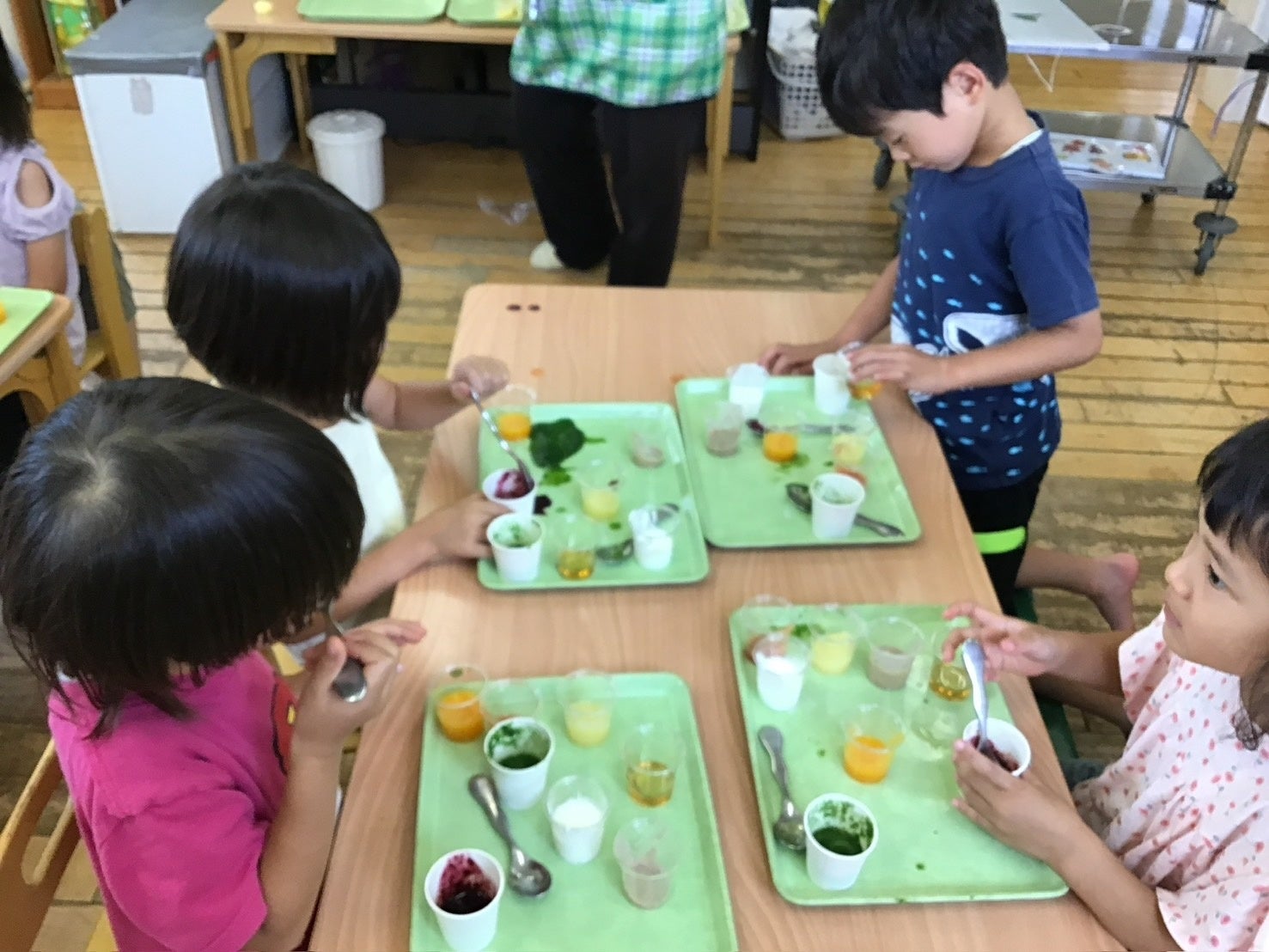 5歳児クラスでは、園児からの「スムージーを作りたい!」という提案を受け、スムージー作りに挑戦しました。園児たちは話し合いながら苦手な野菜を克服するためのレシピを考案し、夏祭りでスムージーを提供。保護者の方々からも「家でも試してみたい」と好評を得ました。