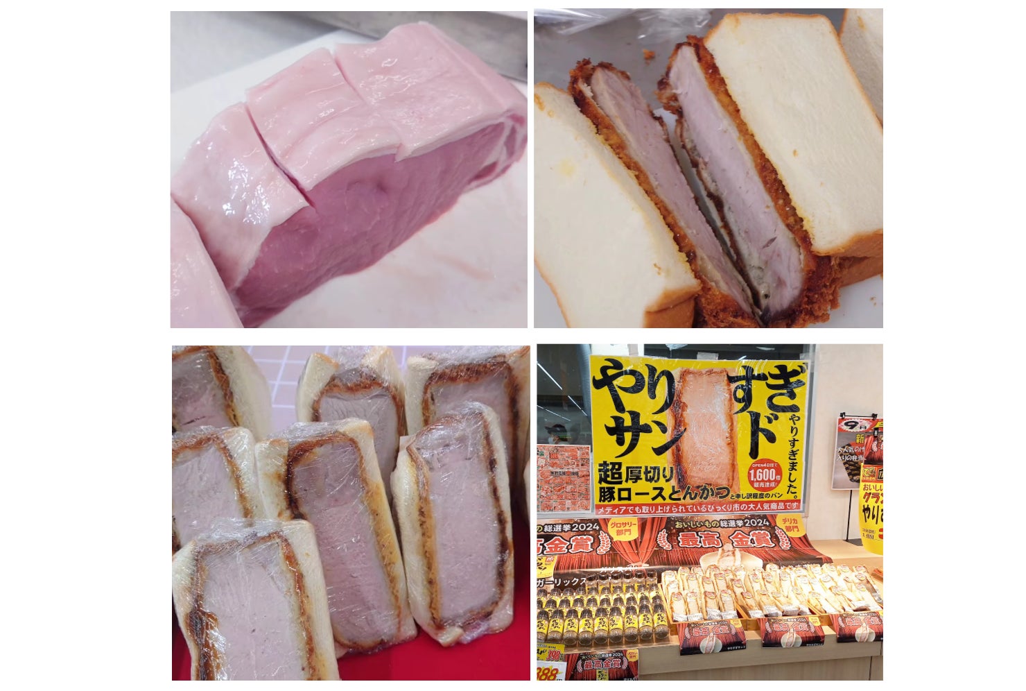 「週末びっくり市」は山形県・宮城県に店舗をもつ、肉の卸問屋が手がけるスーパーマーケットです。精肉部門での強みを生かして誕生したカツサンド「やりすぎサンド」は「とにかく振り切った商品を販売したい!」という想いから生まれた商品。やりすぎでは?というほどの超厚切りの豚ロース肉のカツを申し訳程度のパンでサンドしたインパクトのあるビジュアルが特徴です。豚ロース肉の価格によって変動しますが、現在の通常価格は1個486円~538円、特別セール時には430円で販売することもあります(いずれも税込)。