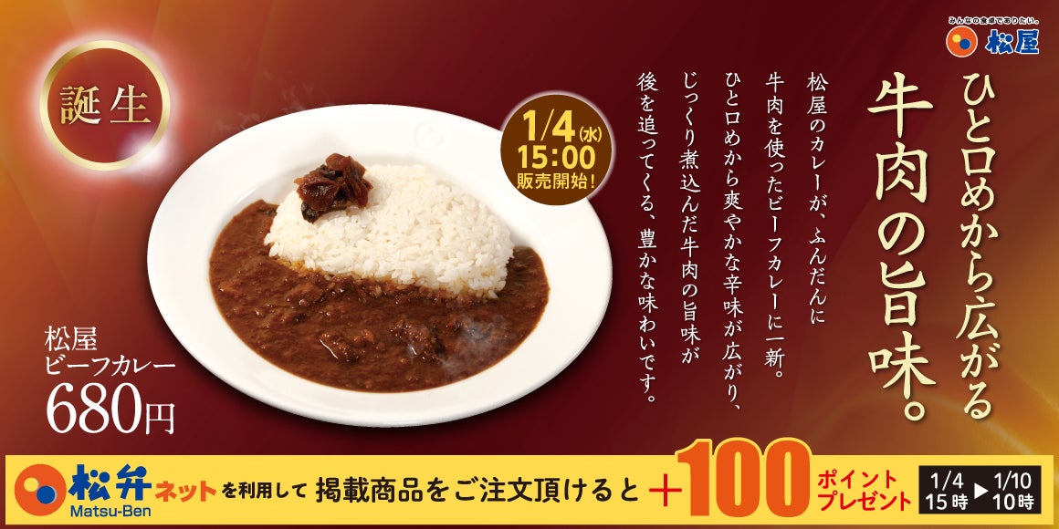 2023年1月4日(水)15時~2023年1月10日(火)10時まで、松弁ネットを利用して「松屋ビーフカレー」関連商品をご注文頂けると、100ポイントプレゼントいたします。
