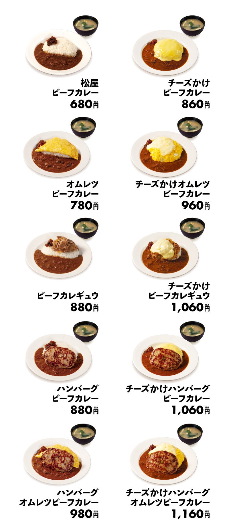 | 商品名 松屋ビーフカレー 680円 オムレツビーフカレー 780円 ビーフカレギュウ 880円 ハンバーグビーフカレー 880円 ハンバーグオムレツビーフカレー 980円 ※お持ち帰りいただけます。お持ち帰りにみそ汁は付きません。 お持ち帰りの場合、みそ汁は別途60円でお求めいただけます。 ※税込み価格です。 ※上記「松屋ビーフカレー」関連メニューに関し、チーズトッピングは+180円かかります。 ※「オリジナルカレー」関連商品は順次終売となります。 ※朝定食小鉢「ミニカレー」は順次終売となります。 発売日 2023年1月4日(水)午後3時 ~ 対象店舗 一部店舗を除く全国の松屋 |