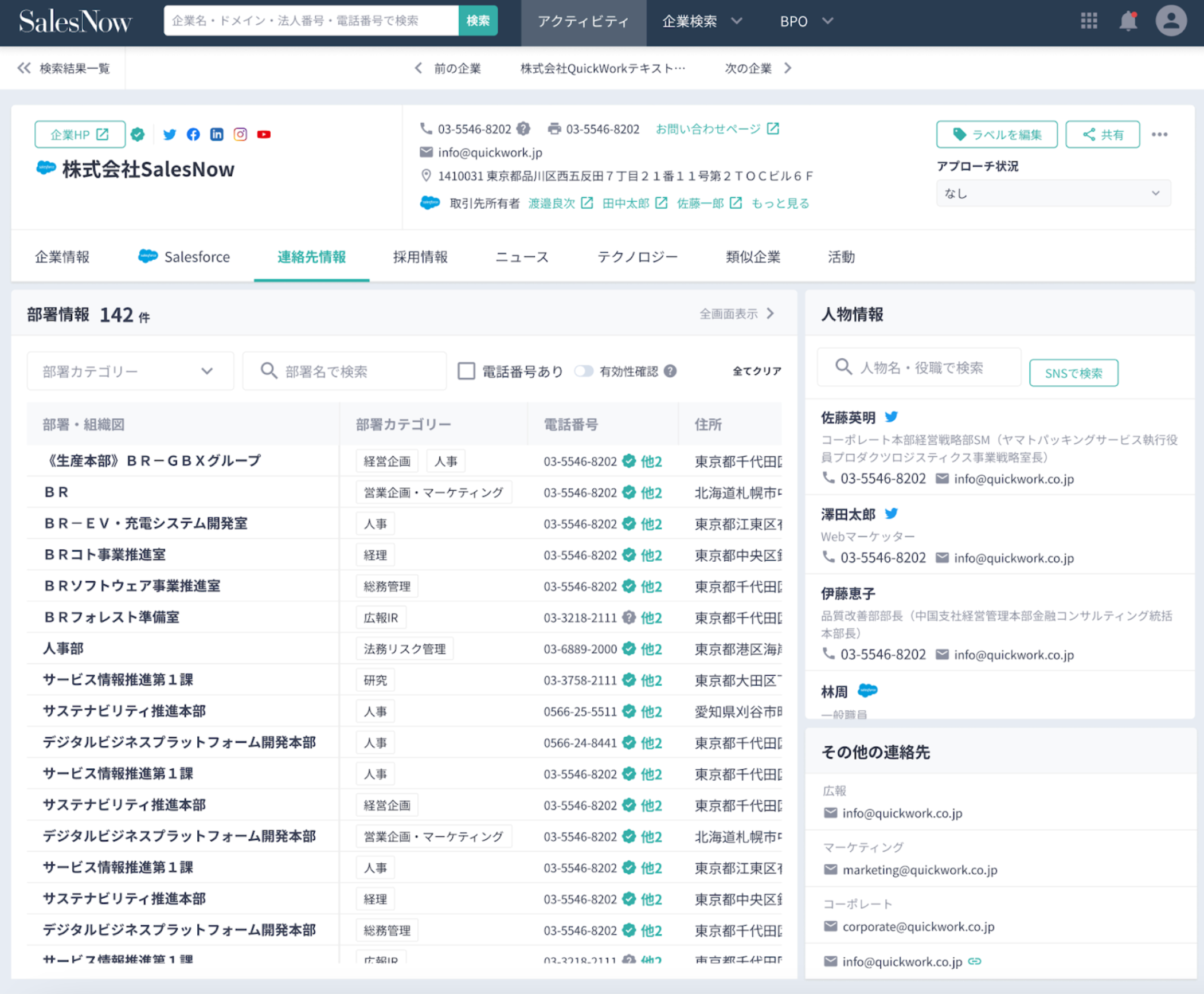 企業詳細ページのイメージ。企業に紐づく連絡先として、部署電話番号や部署メールアドレス、人物情報、SNS情報などを一覧で確認いただけます。
