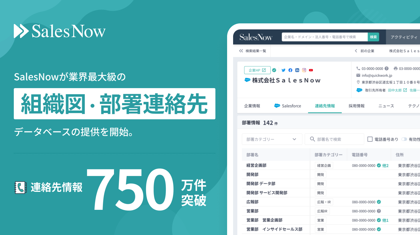 【連絡先情報750万件突破】SalesNowが業界最大級の組織図・部署連絡先データベースの提供を開始。