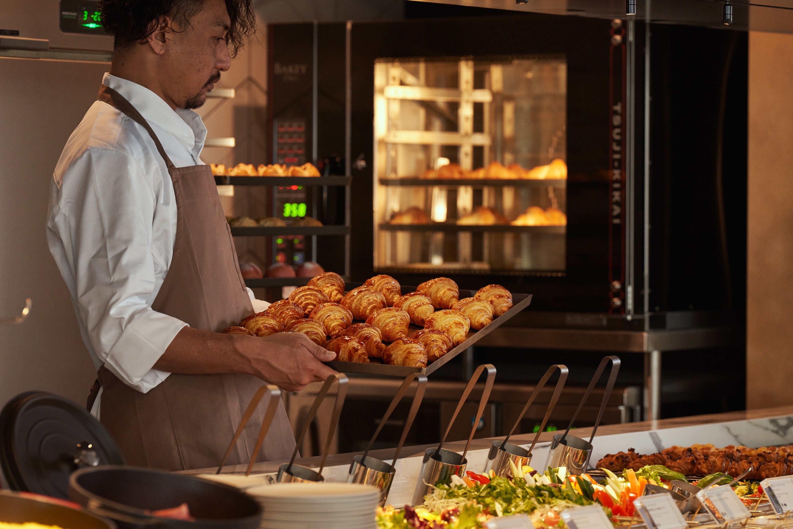 毎朝、焼き立ての香ばしいパンとバターの香り、そして淹れたてのコーヒーの香りが漂います。専属のシェフ・ブーランジェがビュッフェカウンターで焼き上げる「発酵バターのクロワッサン」をはじめとする焼き立てのパンと、日替わりで提供される「6種のパワーサラダ」を名物とした、洋食を中心とした全40種以上のビュッフェメニューです。