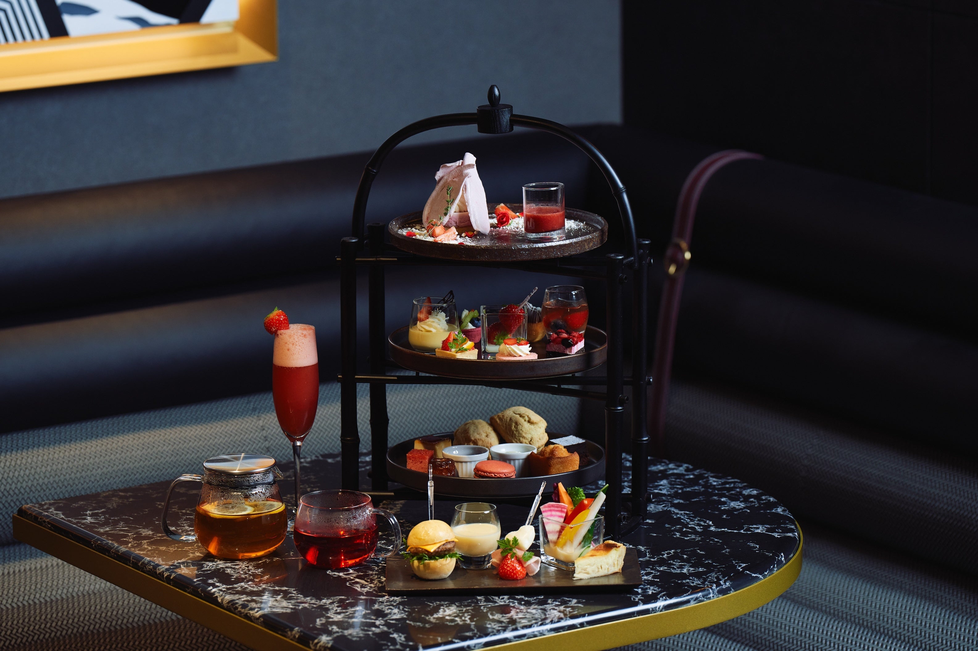 専属パティシエによる手作りスイーツ、季節のフルーツを中心としたアフタヌーンティーセットをご用意しております。紅茶はドイツ ロンネフェルト社の厳選された高品質な茶葉を12種類ご用意。何杯でもおかわりいただけるフリーフローとなっております。