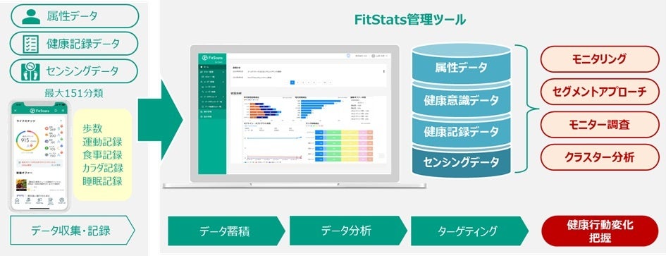 ○「FitStats」では、利用者の属性情報だけでなく、生活習慣・ライフログ・スコアリング結果など、健康に関する詳細なデータが活用できます。