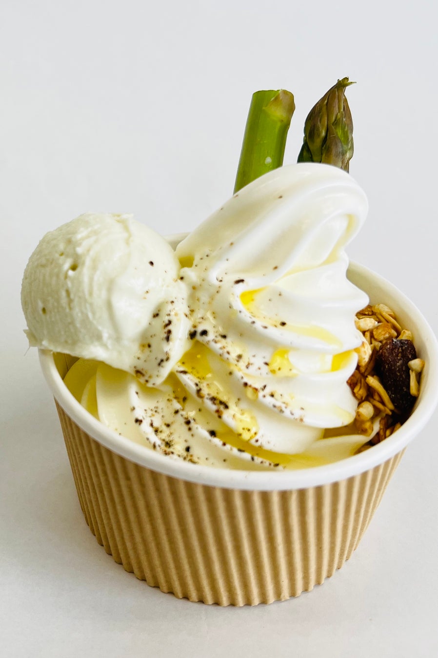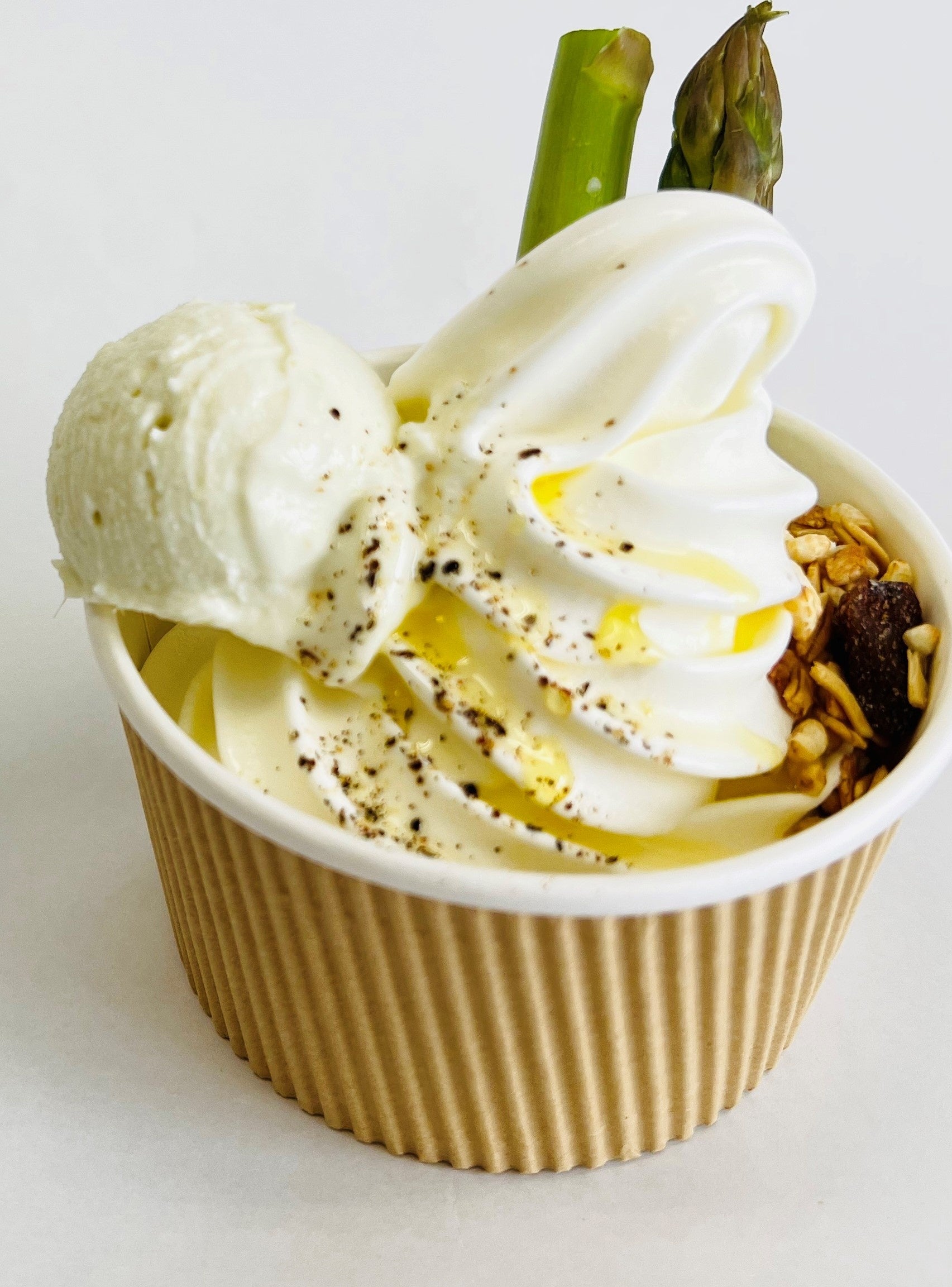 放牧牛の牛乳のソフトクリームをベースにアスパラアイスやボイルしたアスパラをトッピングしました。
