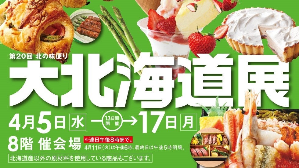 横浜高島屋では、4月5日(水)~17日(月)の期間、「第20回 北の味便り 大北海道展」を開催いたします。今回はマスク着用ルールが緩和されるなど、以前の日常を取り戻しつつある中での開催となり、約10店舗の横浜高島屋初登場ブランドを揃え、魅力を更にアップさせた開催となります。その場で出来立てを提供する「実演コーナー」も前年から6店舗を増やして充実させました。その中でも注目は、『甘い』・『濃厚』・『太い』の3拍子揃った旬真っ盛りのみずみずしい【道産アスパラガス】を使用したグルメや、北海道ならではの低い気温で長く熟成させた【道産いちご】を使用したスイーツです。そのほか、これからの行楽シーズンやランチにぴったりな北海道の魅力を詰め込んだお弁当もご用意しております。