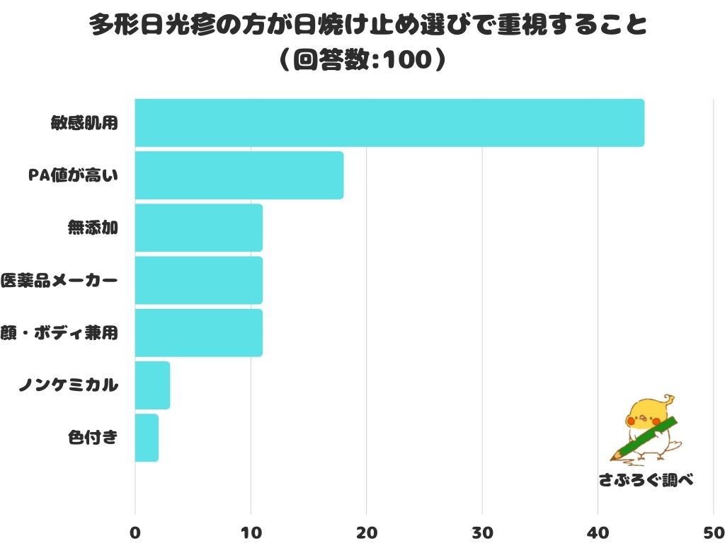 多形日光疹の方が日焼け止め選びで重視することをアンケートにて調査したところ、1位は「敏感肌用」 でした。