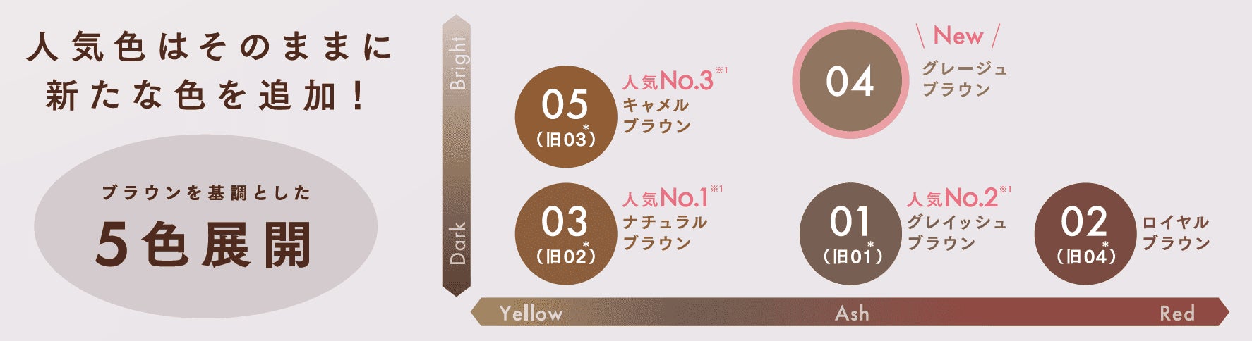 人気色はそのままに、トレンドに合った新たな色を追加。どんな髪色にも似合う色が見つかる5色展開です。