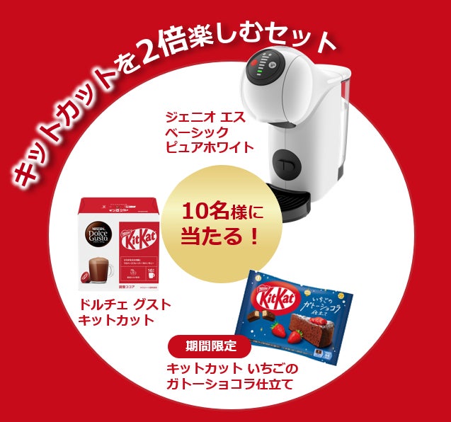 「ネスカフェ ドルチェ グスト ジェニオ エス ベーシック ピュアホワイト」1台、「ネスカフェ ドルチェ グスト キットカット」 1箱、「キットカット いちごのガトーショコラ仕立て」 1袋