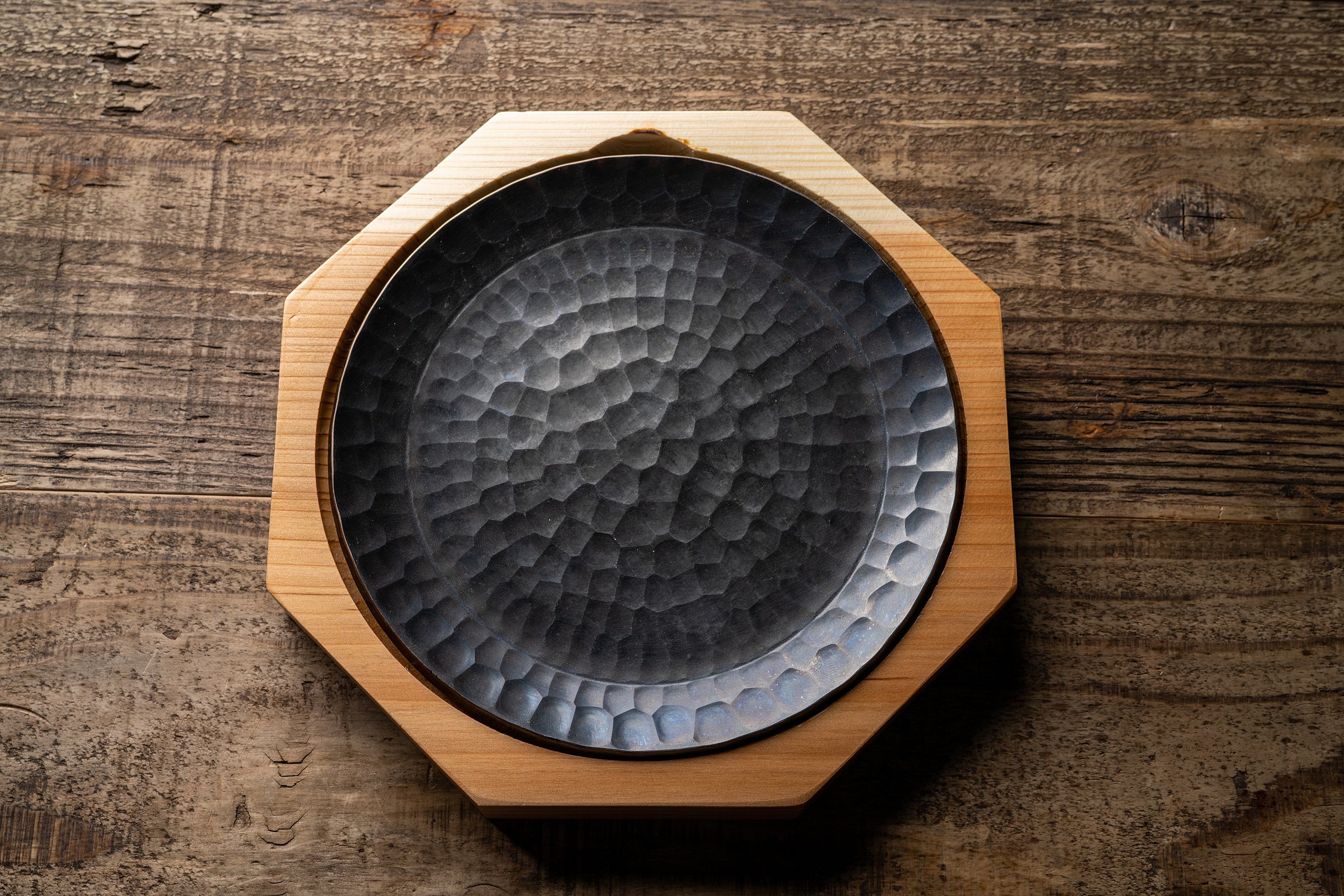 鉄板には、規則的なリズムを刻んだ槌目が並んでいます。ひと打ち150~200tの槌打ちを1枚当たり200~300回繰り返すことで鉄組織の隙間を潰し、粘りと強度を生み、熱伝導や蓄熱性を高めます。