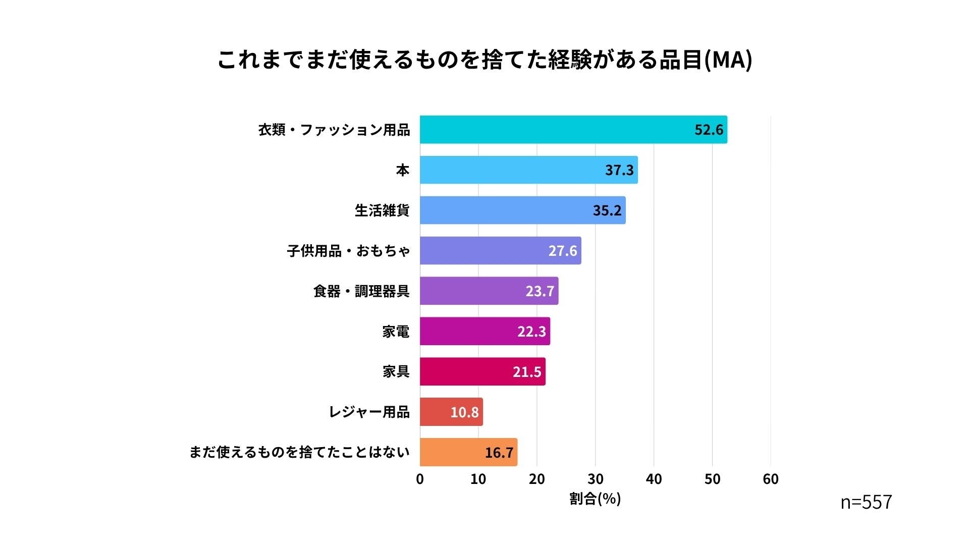 本調査の結果、8割以上の回答者が「まだ使えるものを捨てた経験がある」ことが判明しました。一方で、その半数以上が捨てる際に罪悪感を感じており、「捨てたくない」という理想と、「捨てる」という現実の行動にギャップが生じている実態が明らかになりました。