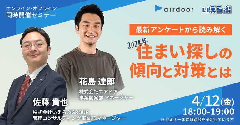 2024年4月12日(金)、株式会社いえらぶGROUP(本社:東京都新宿区、代表:岩名泰介、以下「いえらぶGROUP」)は、株式会社エアドア(本社:東京都港区、代表:鬼頭史到、以下「エアドア」)と共催で、不動産管理会社向けの無料セミナーを開催します。
