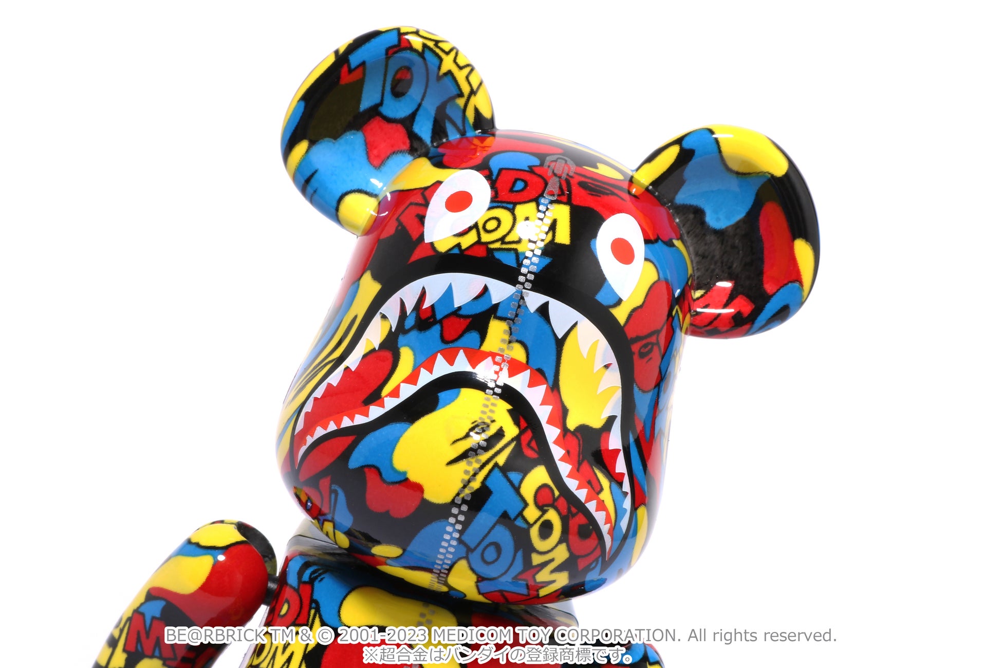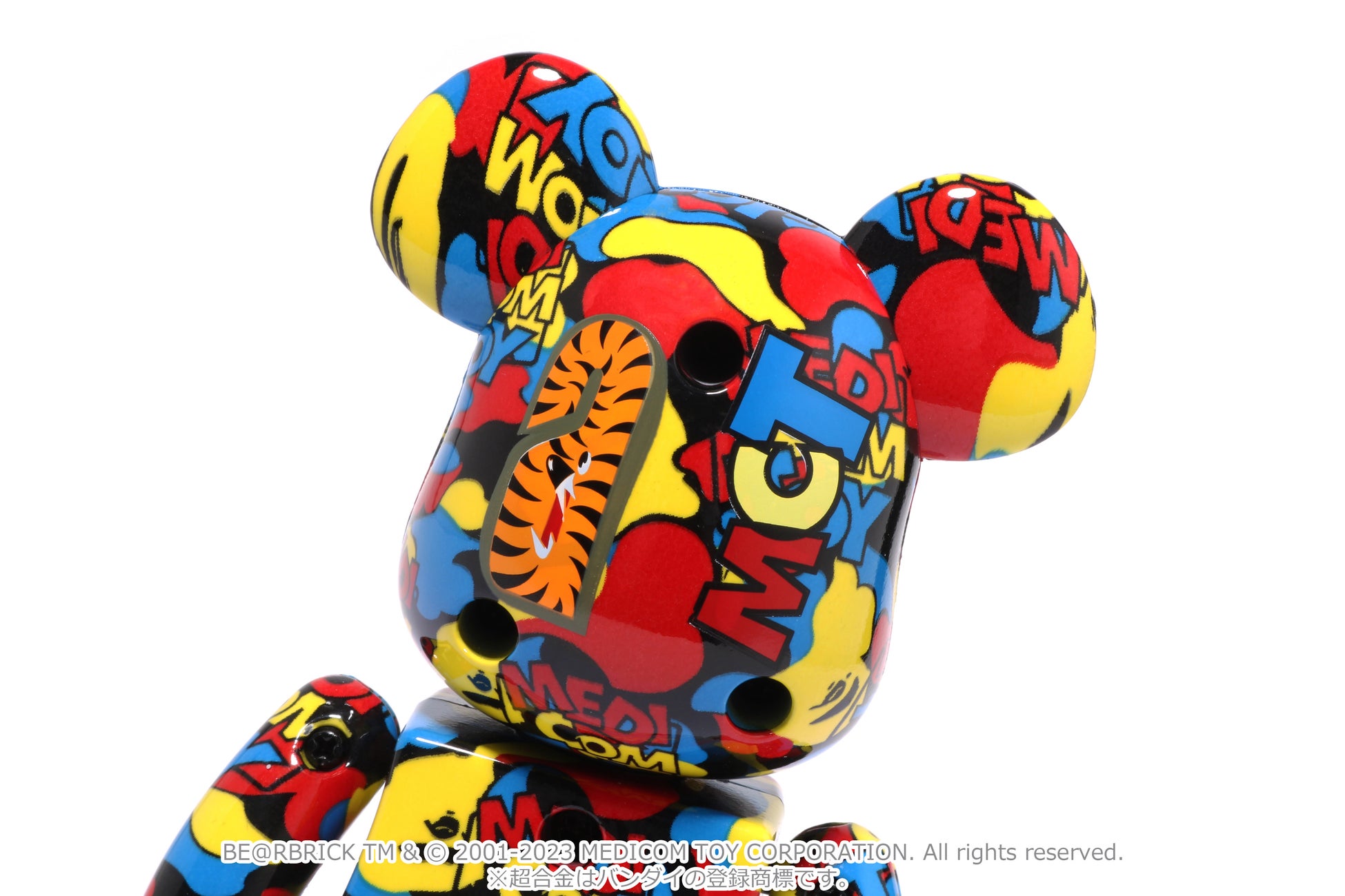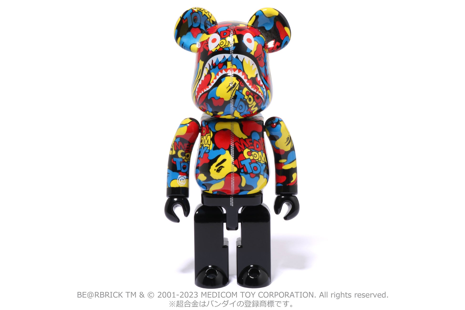 デザインには「BAPE®︎」を象徴するシャークパターンに、「MEDICOM TOY」と「BAPE®︎」のコラボレーションのみで登場するカモフラージュ柄、通称「MCT CAMO」を採用。カラーリングも、「MEDICOM TOY」のロゴに使用されている3つの原色、「赤・黄・青」がベースに。カラフルかつアイコニックな仕上がりになりました。頭部にはコラボレーションを象徴する「MCT」のロゴとトラも配されているなど、細部にまでしっかりとこだわりが詰まっています。
