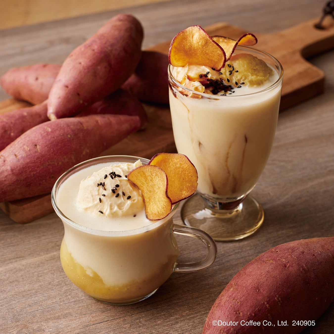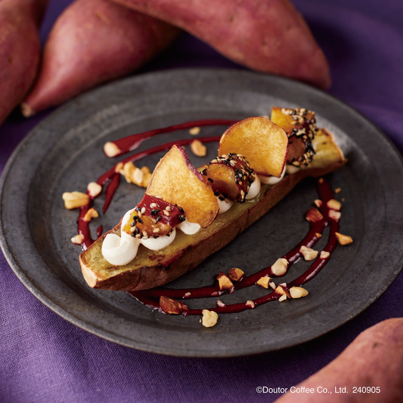 紅はるかとミルクを合わせたなめらかなラテに、黒ごま、紅はるかチップス、カスタードホイップをトッピングし、味わいと食感の変化を楽しめるドリンクに仕立てました。さらに、紅はるかの焼き芋ペーストを添えることで、飲み進めるたびに濃厚な芋感を味わえます。素材の甘味を活かした紅はるかを楽しむラテです。