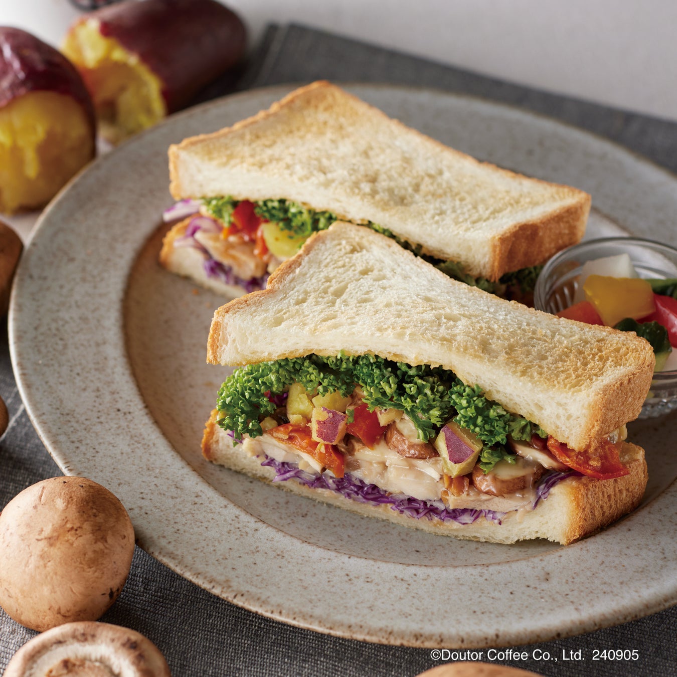 肉厚のローストチキンにさつまいも、マッシュルーム、セミドライトマトをサンドしました。マッシュルームとごま醤油糀のソースの2段重ねで、香ばしく食欲をそそる味わいに仕立てた、秋の味覚を存分に楽しめるサンドイッチ。