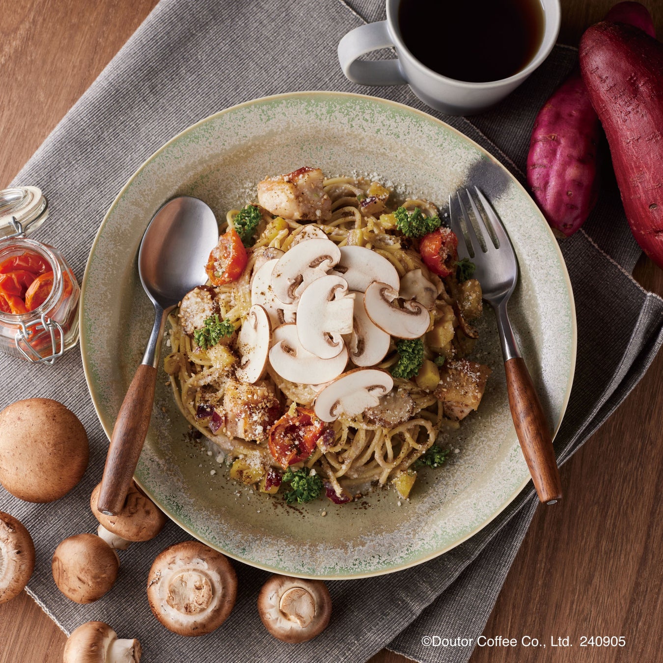 秋の味覚、さつまいもとマッシュルームの食感・味わいを楽しむマッシュルームづくしのパスタ。豆乳と野菜だしでまとめたやさしい味わいのマッシュルームクリームソースの味わいに、ソテーしたマッシュルームと本来のフレッシュな香りが広がる生食スライスマッシュルームを盛り合わせました。仕上げに利かせたパセリや、ごまとパルミジャーノチーズ、黒煎り七味のアクセントも食欲をそそります。