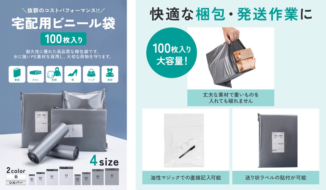 ポリエチレン素材を用いることで、お客様に配送する大切な商品を、水や衝撃からしっかり保護します。サイズもB5からA2相当まで、幅広く全4サイズ展開します。 -