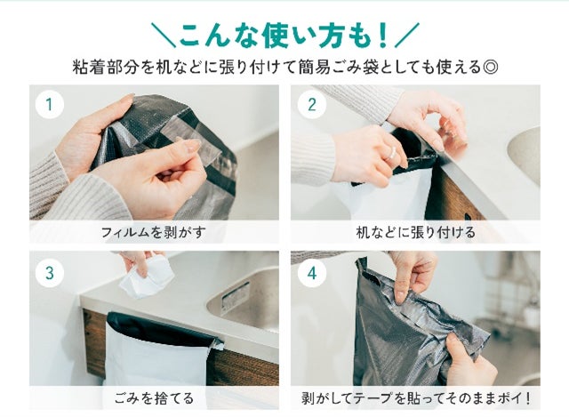 粘着部分を剥がして机や台所などに貼り付ければ、簡易ゴミ袋としてもご利用いただけます。