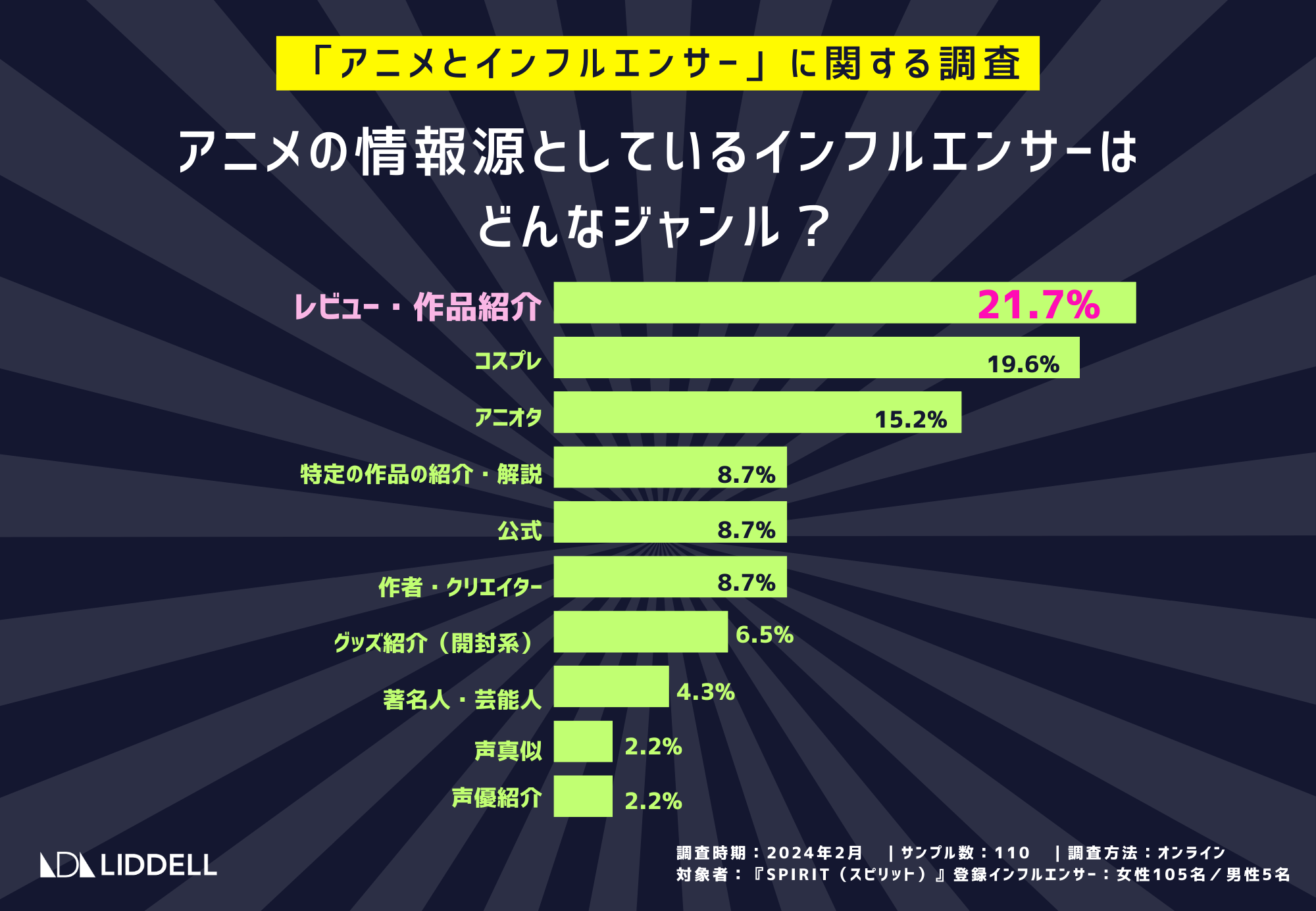 「アニメの情報源としているインフルエンサーはどんなジャンル?」を聞いたところ、最も多いのは「レビューや作品紹介系」で21.7%、次いで「コスプレ系」が19.6%、「アニオタ系」は15.2%、「特定の作品の紹介・解説系」と並んで「公式」「作者・クリエイター系」が8.7%という結果となりました。