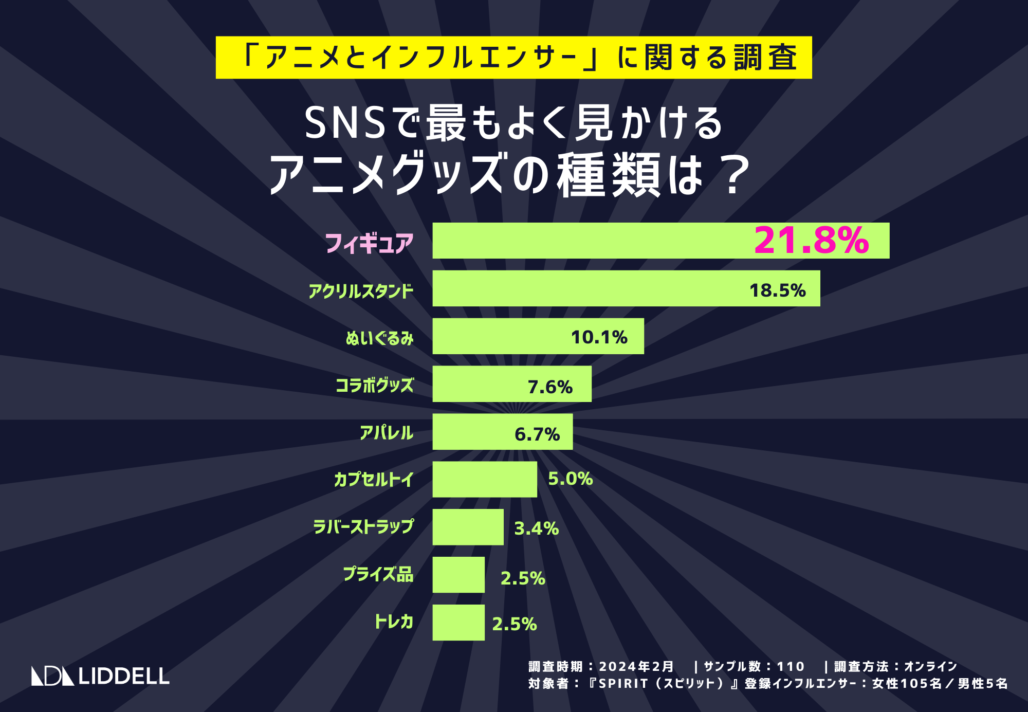 また、よく見かけるグッズの種類に関しては、最も多かったのが「フィギュア」で21.8%、次に「アクリルスタンド」が18.5%、「ぬいぐるみ」が10.1%、「コラボグッズ」が7.6%となりました。