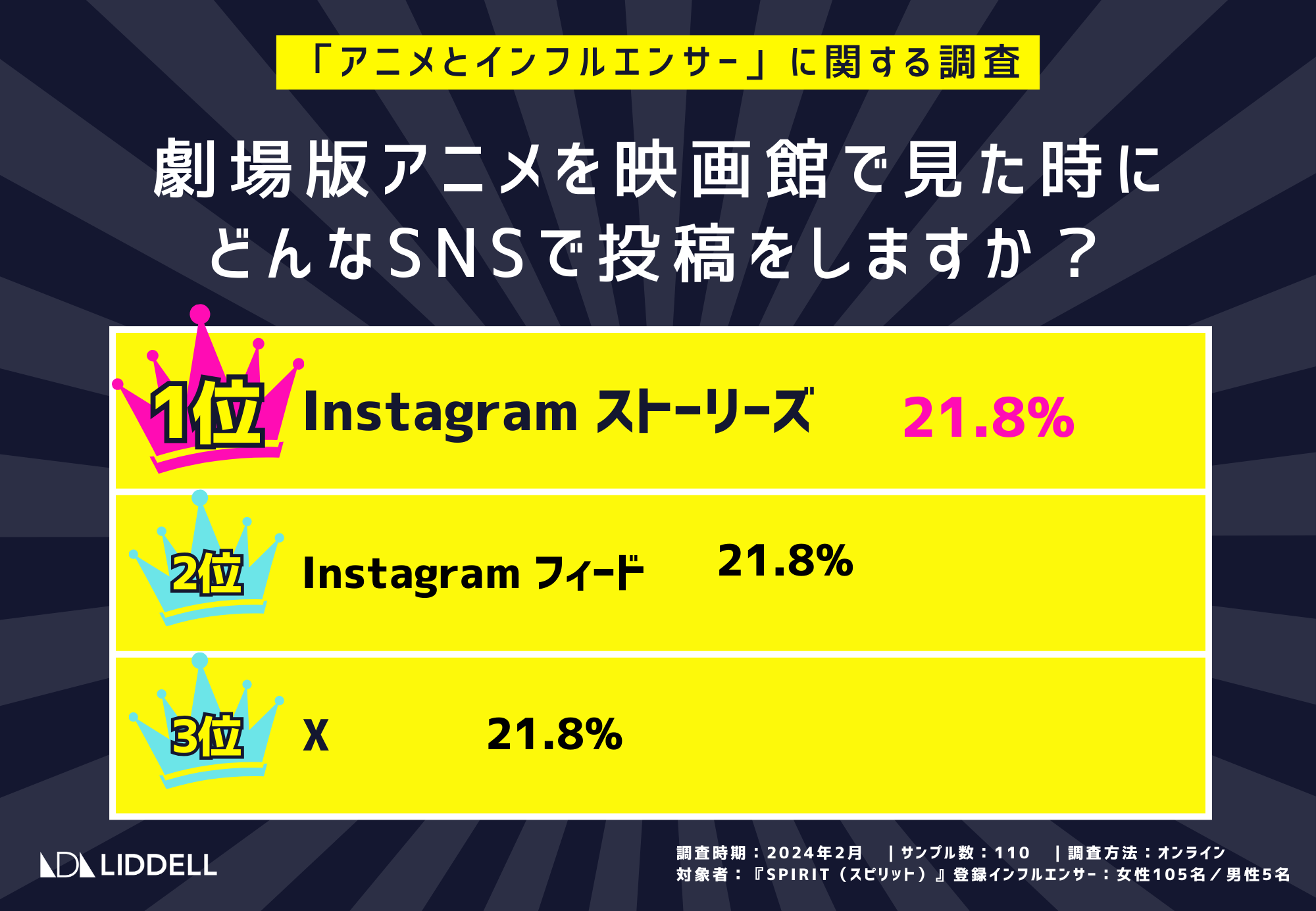 劇場版アニメの感想は「Instagramストーリーズ」で投稿する人が最も多く76.6%でした。次いで「Instagramフィード」が21.3%、「X」が19.1% でした。