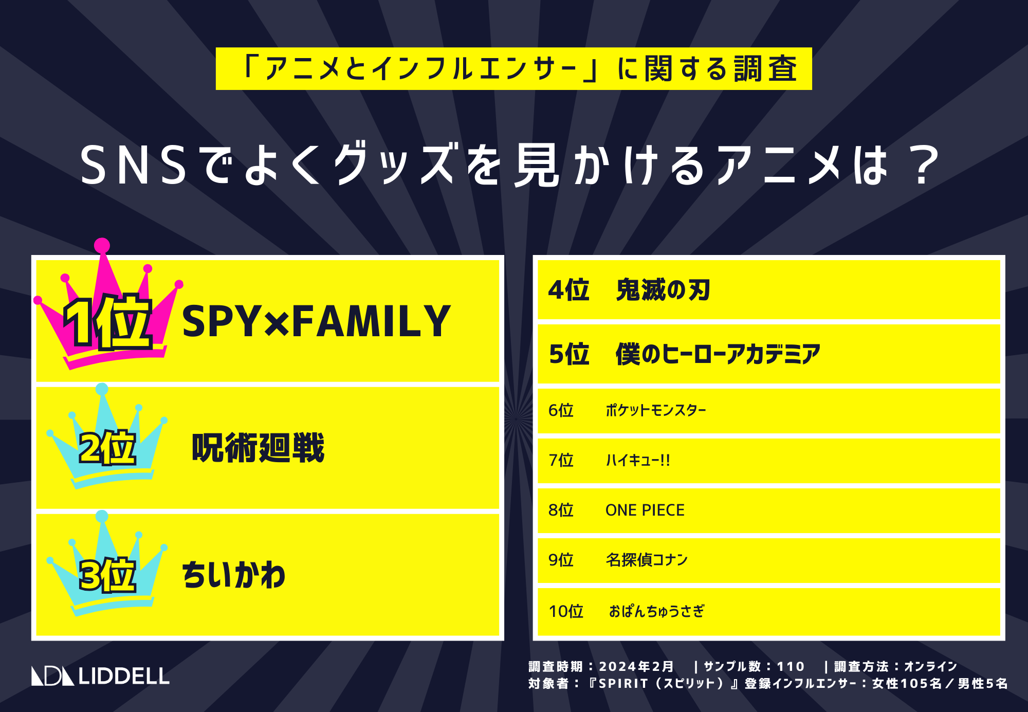 SNSでよく見かけるアニメグッズは『SPY×FAMILY』のアーニャグッズ。フィギュアやぬいぐるみ、プライズ品。『呪術廻戦』では、フィギュア、コラボグッズに次いでアクリルスタンドという結果になった。