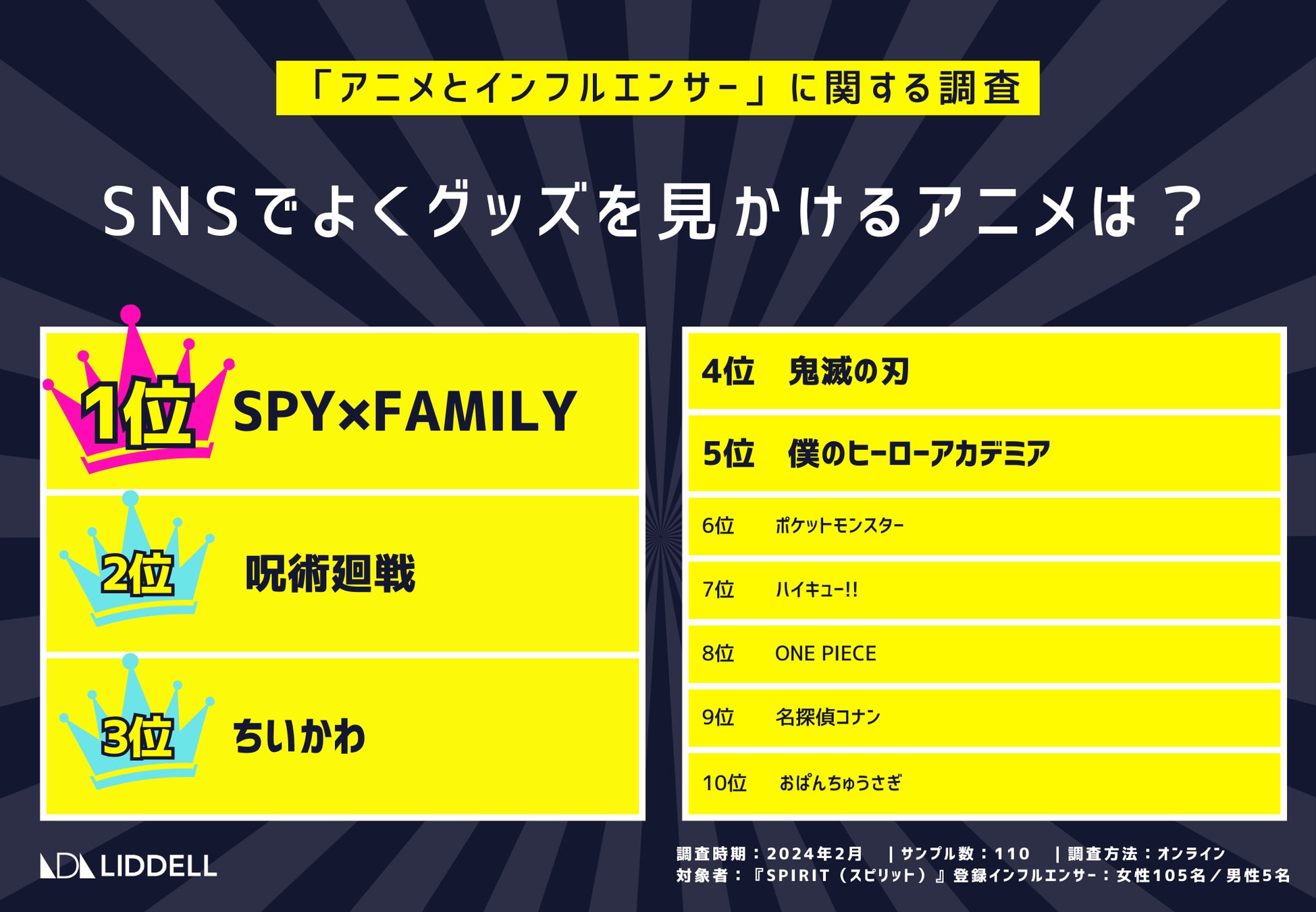 SNSで最もよく見かけるグッズは『SPY×FAMILY』のアーニャグッズが13.3% でした。次いで、『呪術廻戦』が10.5%、『ちいかわ』『鬼滅の刃』が同率で6.3%でした。