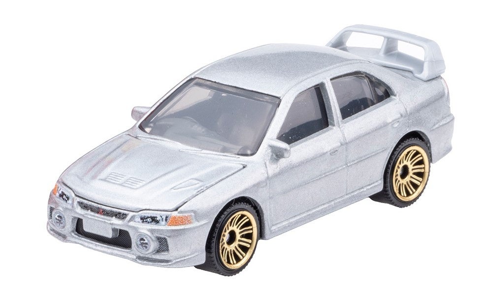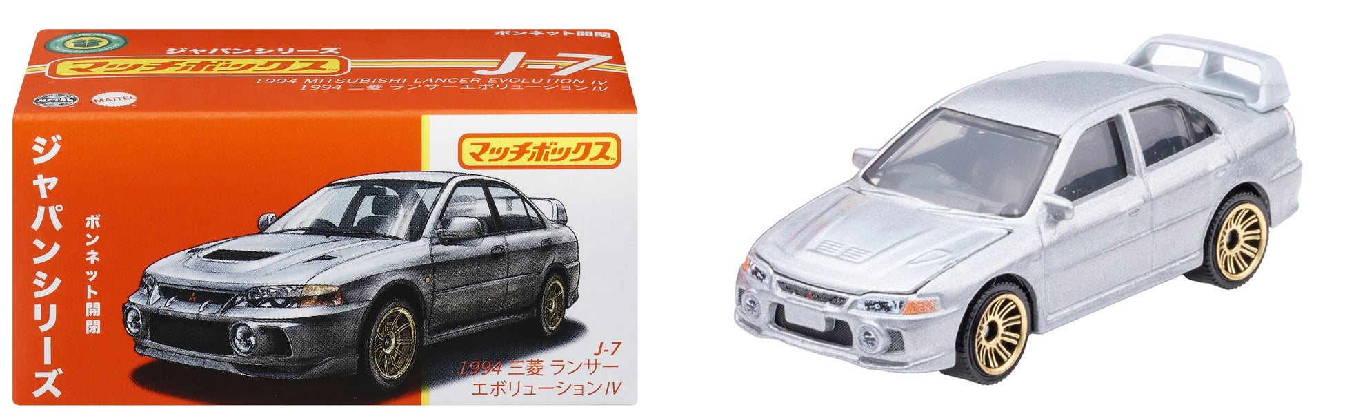 1992年に小型セダンのランサーに、中型セダン、ギャランの最強モデルであるVR4用の2リッターターボとフルタイム4WDシステムを移植して生まれたランサーエボリューション(ランエボ)をマッチボックスでは第2世代のトップバッターとなったエボリューションIV(エボIV)を、ジャパンシリーズデビューの新金型でリリース致しました。太いタイヤを履くために年々ボディが幅広くなっていくランエボの中では、エボIVは最後の5ナンバーサイズ(全幅1,700mm以下)車で、世界ラリー選手権で大活躍するなど現在も高い人気を博しています。歴代ランエボの中でも最も生産台数が多いことで知られており、開閉式のエンジンフードを開けると赤いヘッドが特徴の4G63エンジンが確認できます。