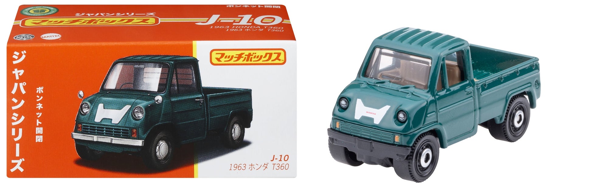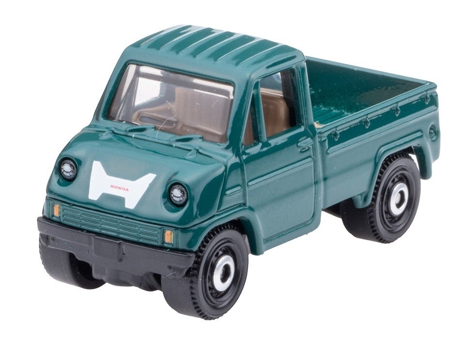 バイクメーカーとして始まった、ホンダ初の4輪自動車として1963年に発売されたのが軽トラックのホンダT360です。単なる軽トラックではなく、当時は一部の海外製高級スポーツカーにしか搭載例のなかった、DOHCエンジンを日本の量産車としては初めて採用しており、またそのエンジンも車体中央にマウントされるなど、独創的なクルマとして有名になりました。実車同様、ヘッドライトを車体側に残して開閉するフロントフードが何よりものチャームポイントで、すでにマッチボックスの大人気金型で、初版の水色、第2版の黄色×赤ストライプに続く3色目が今回のダークグリーンとなります。