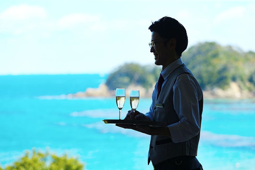 右:TAOYA志摩のもうひとつのご馳走はこの景色です。刻々と表情を変える鳥羽の海を眺めながら、日常では味わうことのない優雅な食のひとときをお楽しみください。