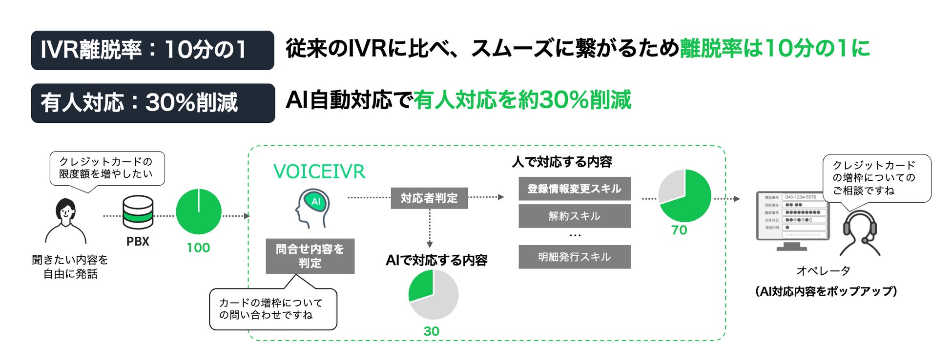 このような機能を活用し「一次対応」を正確に行うことで、先行導入事例では有人対応の30%削減を実現しています。また、ユーザーにとってもボタンプッシュ式のIVRに比べ、圧倒的に使いやすいUIとなるため、IVRで の離脱率を大幅に低減することに成功しています。