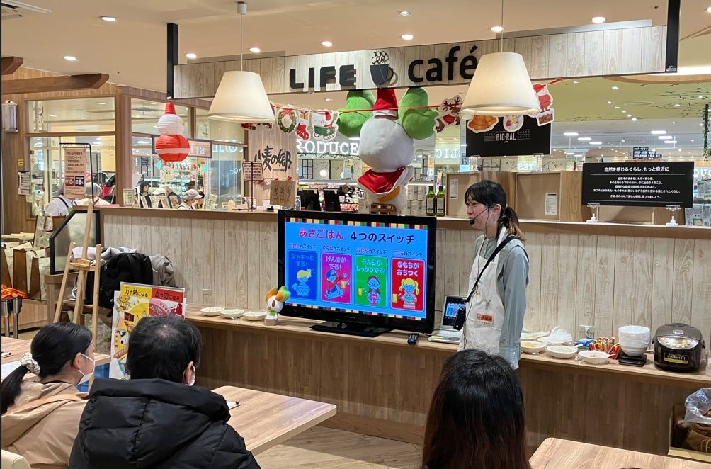 永谷園からは、朝食の大切さについてのお話とお茶づけの試食を行いました。試食の際には、「お茶づけに合うトッピング」を売り場で探し、多数決で選ばれた食材を実際にのせて食べていただきました。