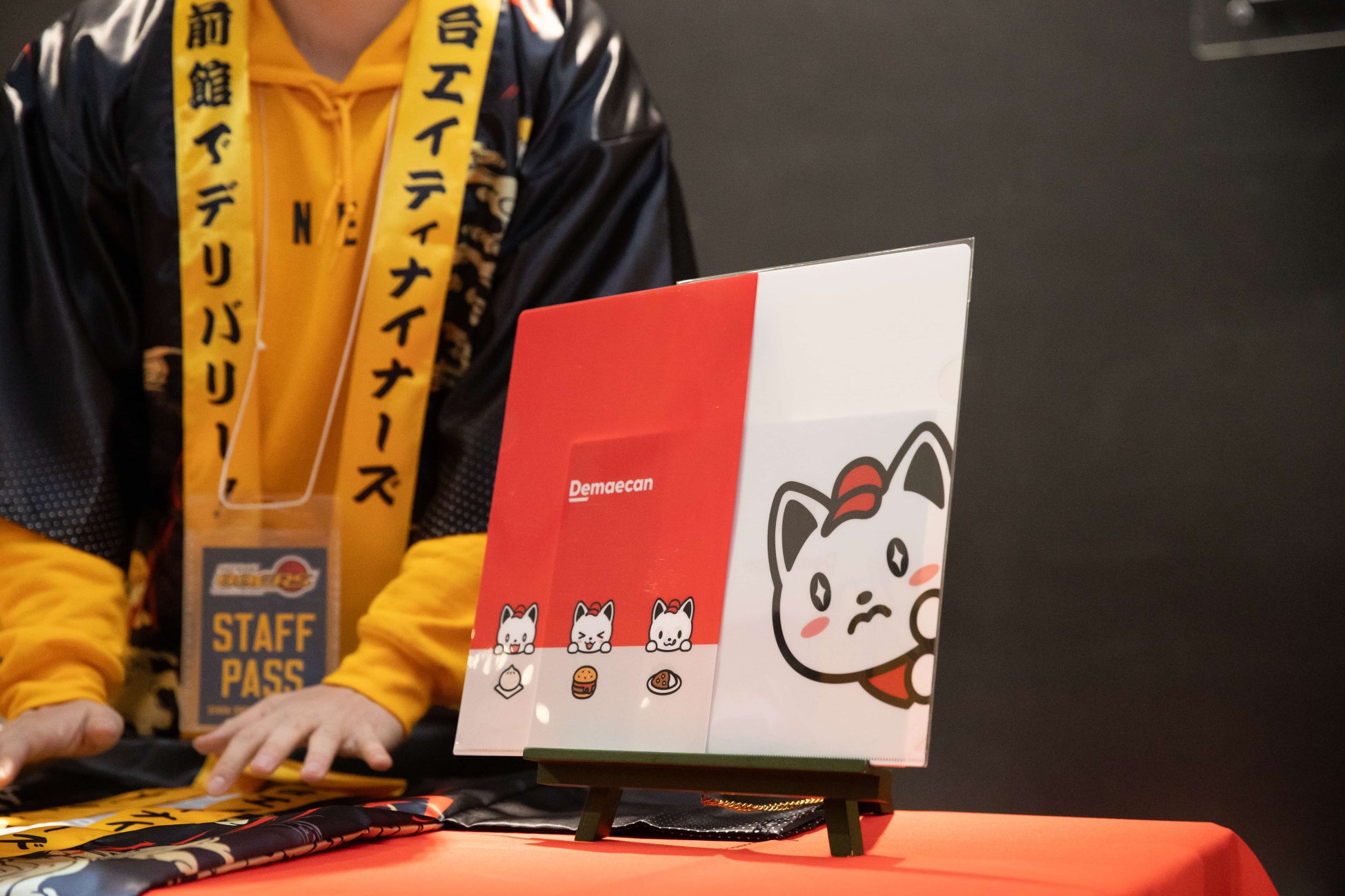 出前館ブースではシュートチャレンジを実施。シュート2本成功で出前館公式マスコットキャラクター・出前にゃんの描かれたオリジナルクリアファイル、3本成功でオリジナル法被をプレゼントいたしました。冠試合当日しか手に入らないオリジナル法被を手に入れようと、多くのファンの方々でブースは大盛況となりました。