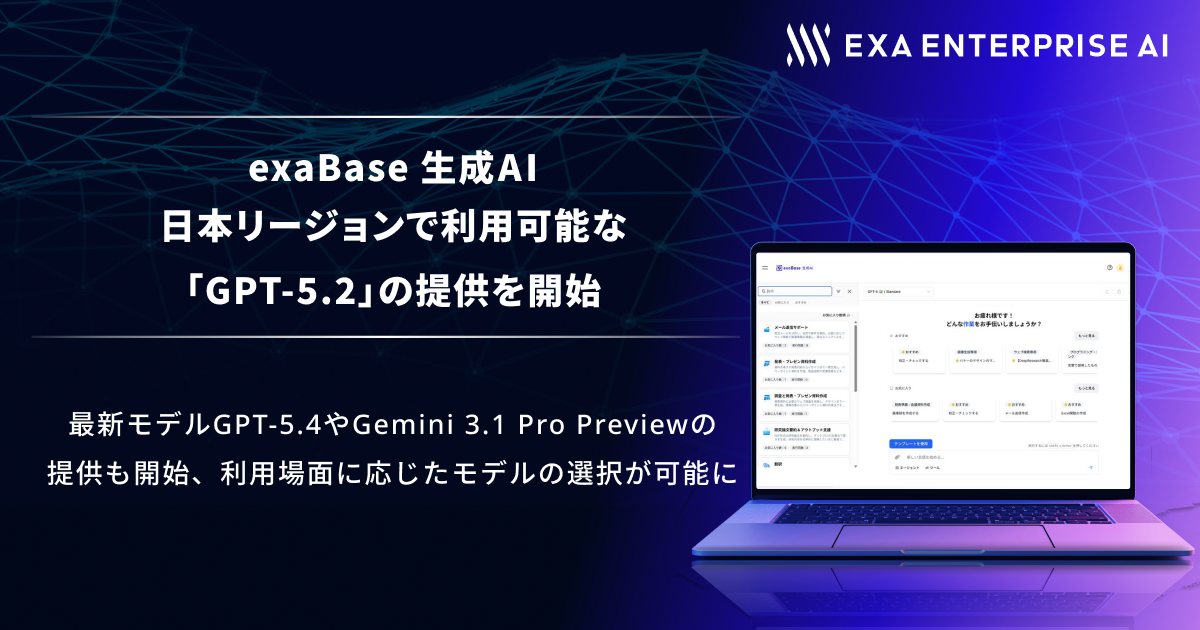 株式会社エクサウィザーズ(東京都港区、代表取締役社長CEO:春田 真、以下エクサウィザーズ)のグループ会社である株式会社Exa Enterprise AI(東京都港区、代表取締役:大植 択真、以下Exa Enterprise AI)は、市場シェアNo.1を獲得した*1法人向け生成AIサービス「exaBase 生成AI」において、OpenAIが開発した「GPT-5.2」の日本リージョンでの提供を開始しました。これにより、日本国内で完結できる環境でGPT-5.2を利用できます。さらに、PTU(Provisioned Throughput Unit)*2を活用することで、処理能力を事前に確保し、ピーク時でも高速かつ安定した環境でexaBase 生成AIを利用いただけます。また、最新モデルの「GPT-5.4」やGoogleの「Gemini 3.1 Pro Preview」の利用も可能となり、場面や用途に応じたモデルの選択が可能となりました。