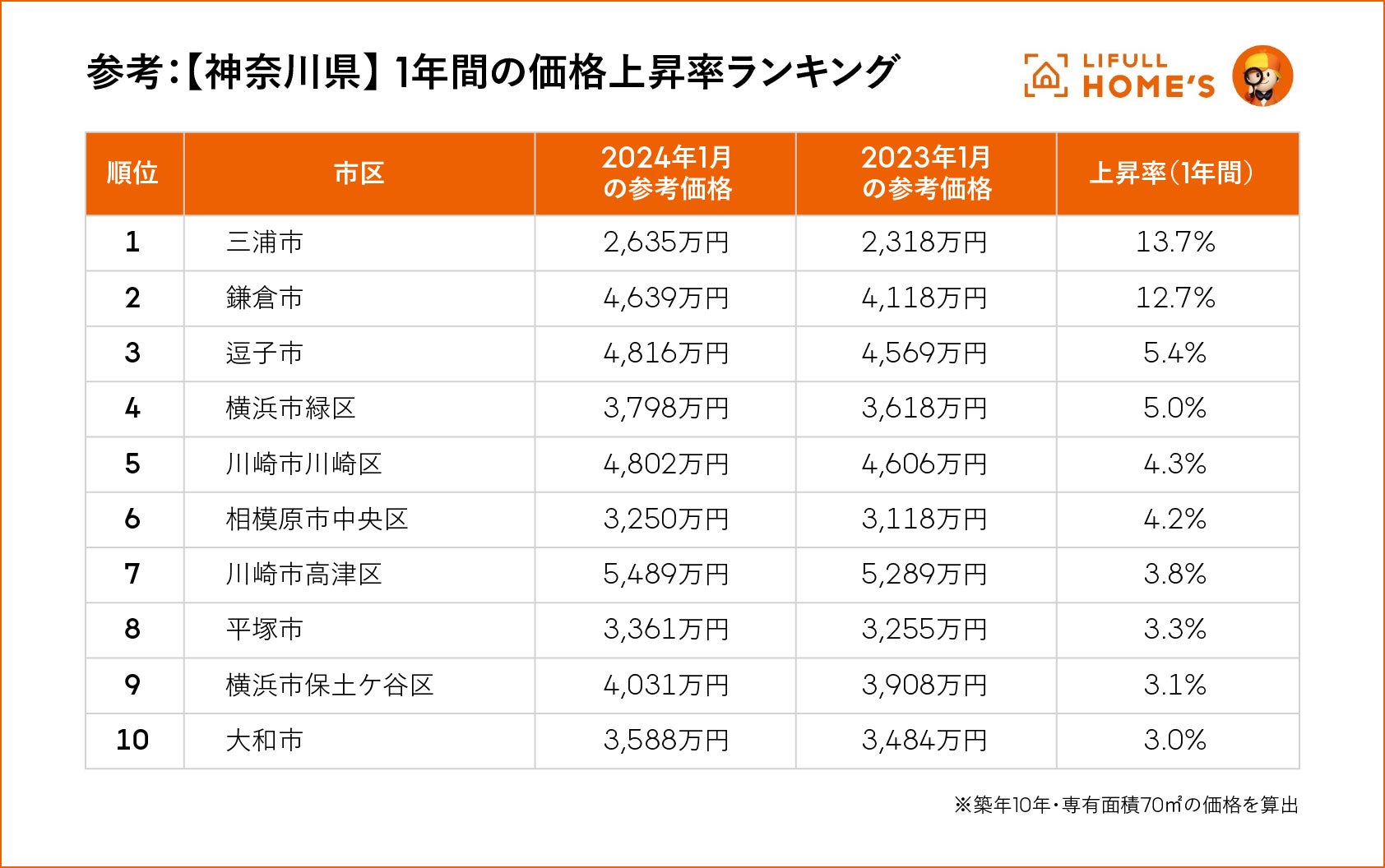 同様に、神奈川県でも横浜市、川崎市など中心エリアの自治体はほぼランキング上位に登場しておらず、1位の三浦市は5年間の価格上昇率が49.7%、2位の逗子市も48.3%と約1.5倍もの価格に上昇していますが、価格自体を確認すると購入を断念するほどの価格水準には達しておらず、昨今の都心周辺での価格上昇を背景として、郊外エリアで値ごろ感、割安感のある中古マンション購入を検討しているケースが増えていることが窺われます。